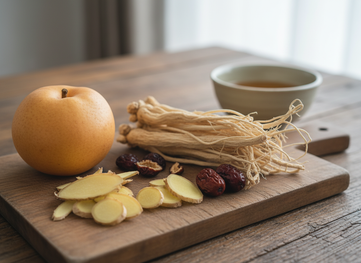 A: 비타민 C가 풍부한 과일(유자, 모과)과 수분 함량이 높은 배, 도라지 등이 좋습니다. 특히 단백질 섭취가 면역 세포 생성에 중요하므로 부드러운 살코기나 두부 등을 챙겨 드세요.