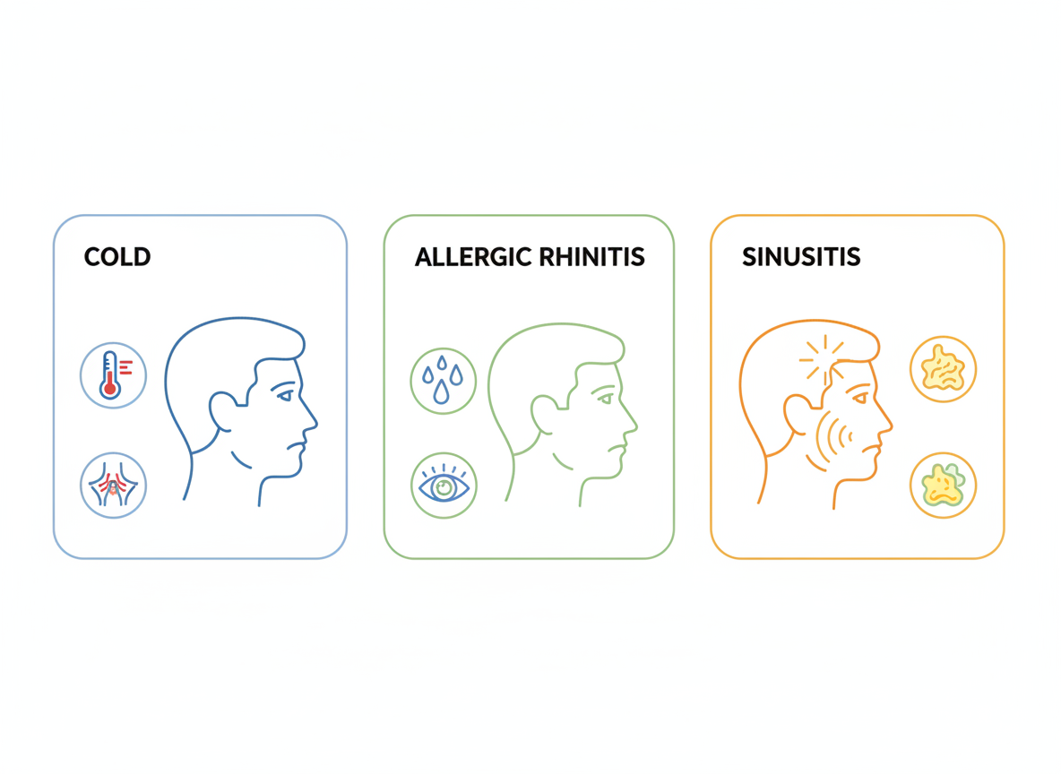 | 주요 증상 | 발열, 인후통, 전신근육통 | 맑은 콧물, 재채기, 눈 가려움 | 누런 콧물, 안면 통증, 코막힘 |