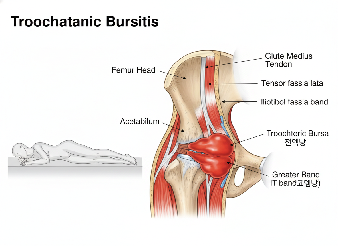 또한, '점액낭염'도 흔한 원인입니다. 뼈와 근육 사이에서 완충 작용을 하는 물주머니(점액낭)에 염증이 생긴 것인데, 주로 엉덩이 바깥쪽이 아픈 것이 특징입니다. 딱딱한 바닥에 옆으로 누울 때 통증이 심해진다면 이 질환을 의심해 볼 수 있습니다.