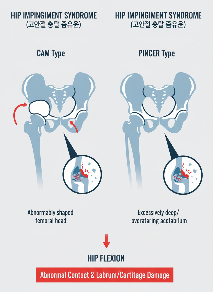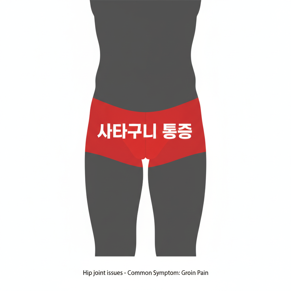 | 사타구니 통증 | 걷거나 다리 들 때, 양반다리 시 악화 | 고관절염, 대퇴골두 무혈성 괴사, 고관절 충돌 증후군 |