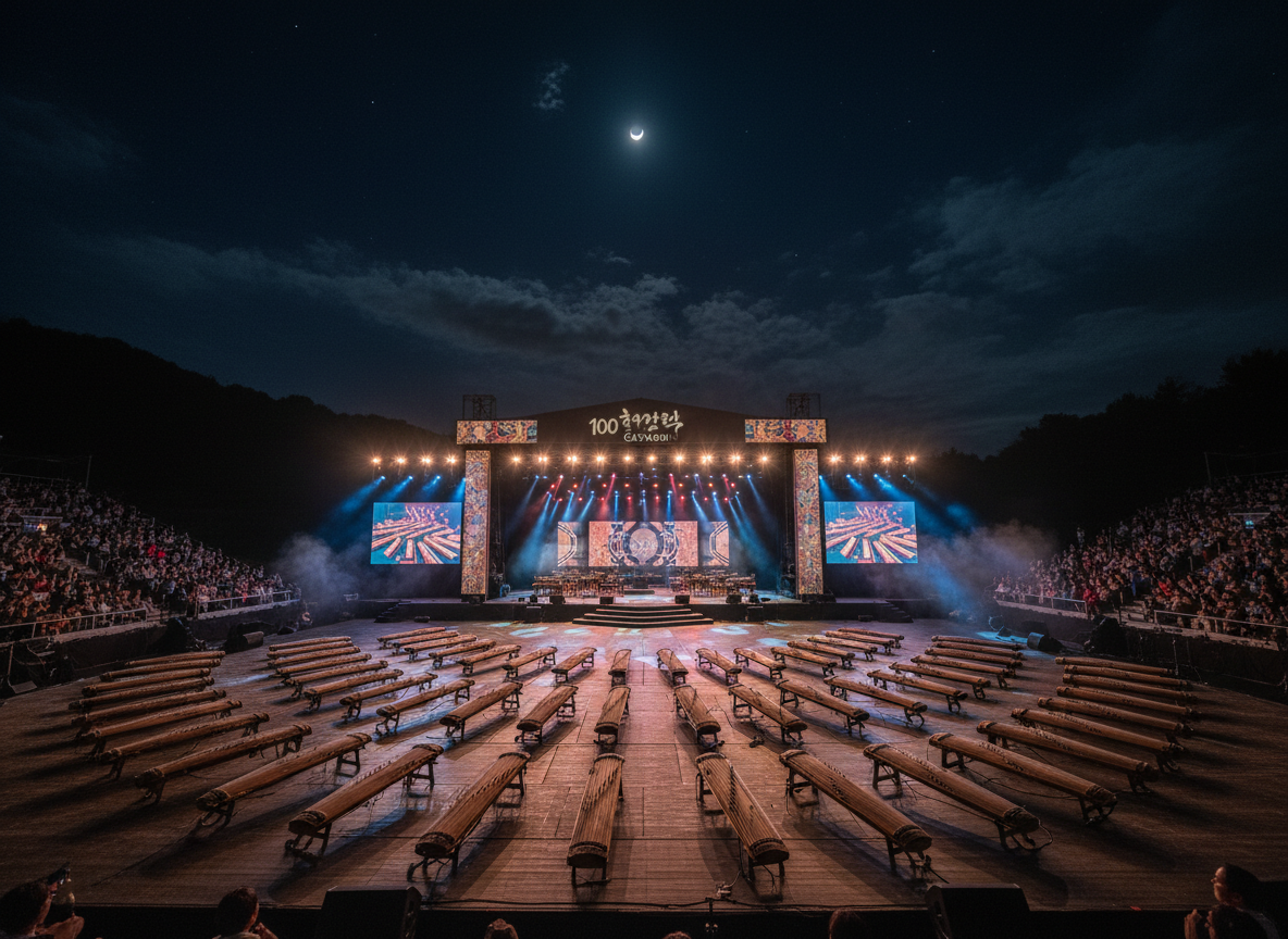 하늘에서는 화려한 별빛쇼가 쏟아져 내리고, 무대 위에서는 무려 백 대의 가야금이 일제히 튕겨지며 장관을 이룹니다. 백 명의 연주자가 만들어내는 웅장하고 영롱한 가야금 선율이 밤공기를 가르며 퍼져나가는 콘서트를 상상해 보세요. 온몸에 소름이 돋고 일상의 스트레스가 눈 녹듯 사라지는 기적을 맛보게 될 겁니다.