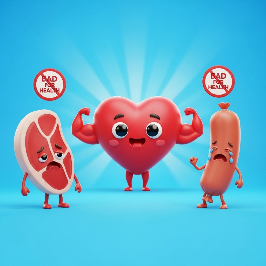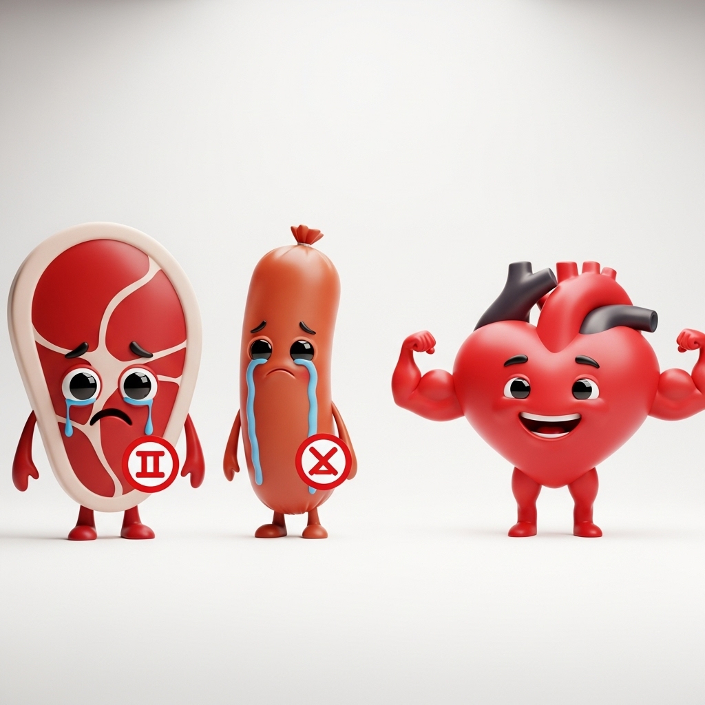 - 붉은 육류/가공육: 삼겹살, 갈비, 소시지, 베이컨 등 고지방 부위와 가공육.