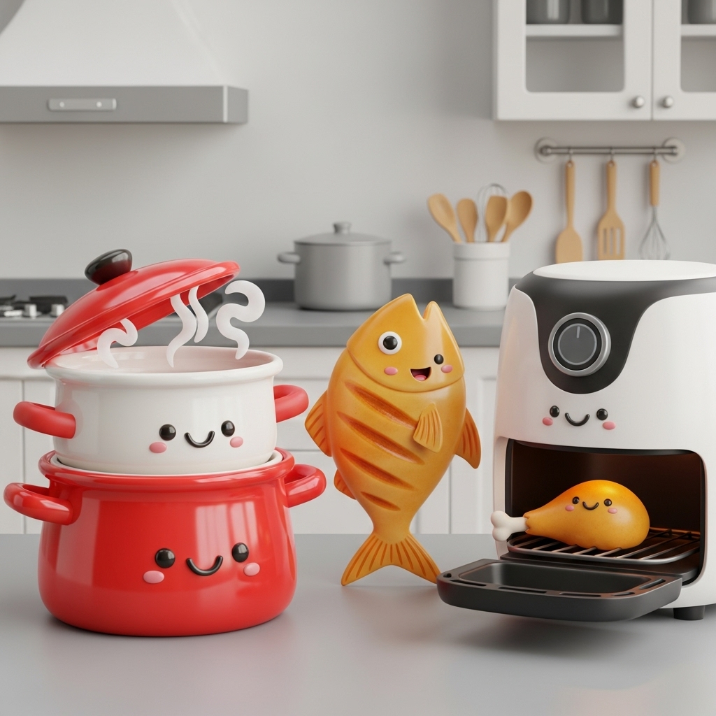 | 조리법 | 튀기기, 버터에 볶기, 기름진 양념 | 삶기, 찌기, 굽기, 에어프라이어 활용 |