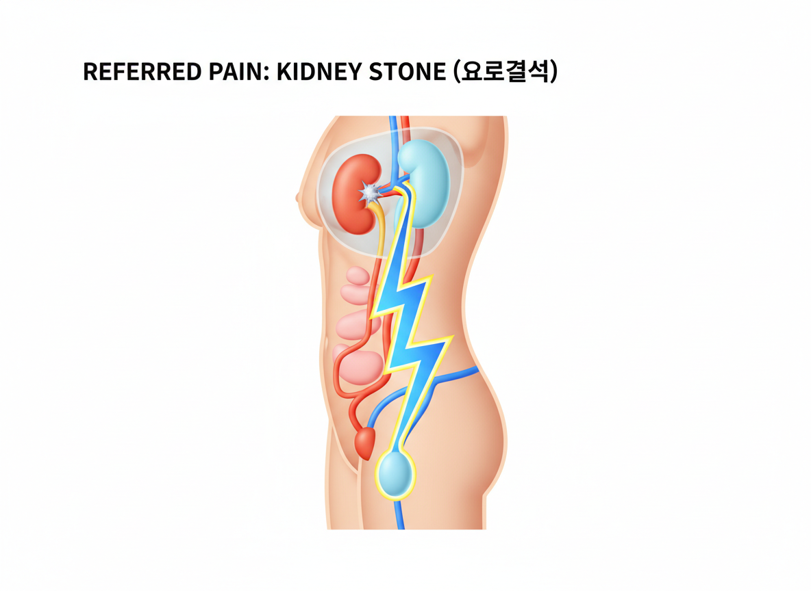 범인은 고환이 아닐 수도 있습니다. 우리 몸의 신경망은 복잡하게 얽혀 있어, 다른 곳의 통증이 고환으로 뻗치는 '연관통'이 발생하기도 합니다. 대표적인 것이 요로결석입니다. 옆구리에서 시작된 칼로 찌르는 듯한 통증이 사타구니와 고환 쪽으로 내려오죠.