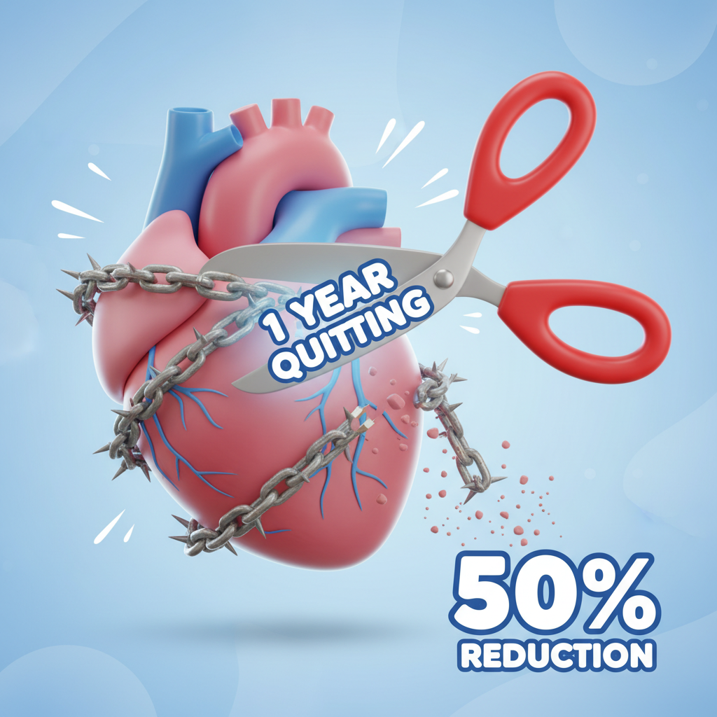 금연 1주년이 되면 심장질환(협심증, 심근경색 등)의 발병 위험이 흡연자의 절반 수준으로 뚝 떨어집니다. 이는 매우 유의미한 수치입니다. 담배가 혈관에 가했던 데미지가 복구되면서 혈전 생성의 위험이 줄어들었기 때문입니다.