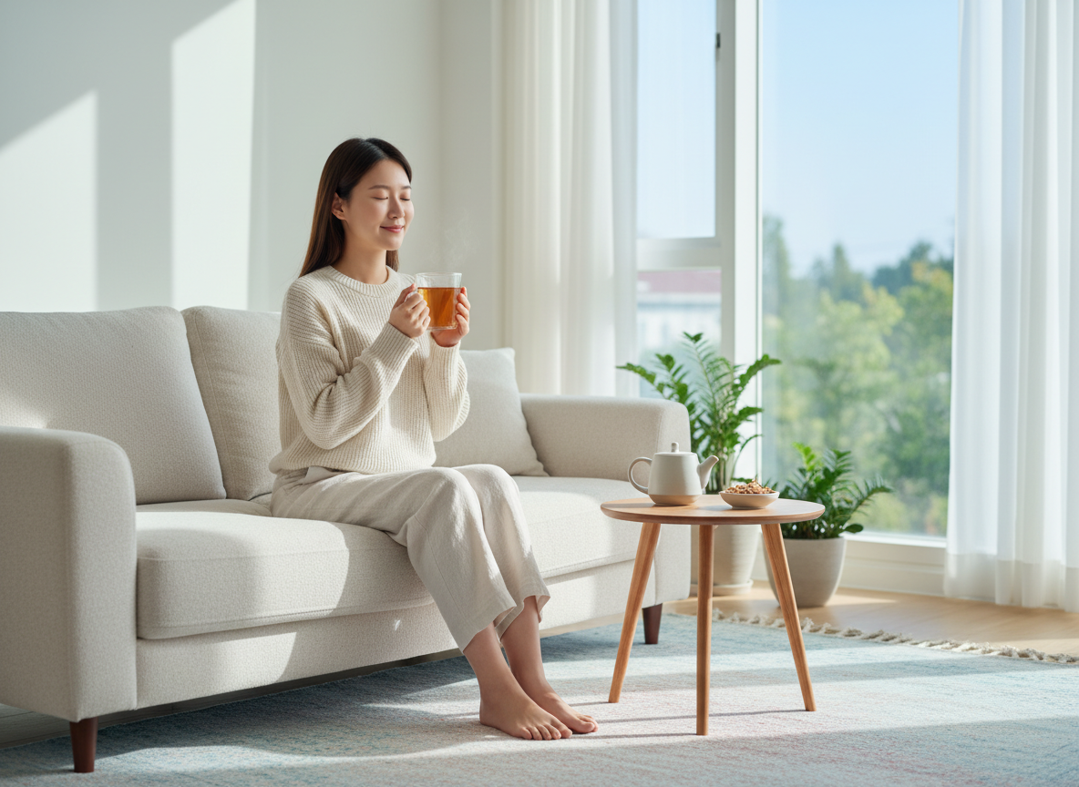 밤에 잠이 오지 않아 뒤척이는 날이 많다면, 둥굴레차에 들어있는 '트립토판' 성분이 도움이 될 수 있습니다. 트립토판은 우리 몸에서 행복 호르몬인 세로토닌과 수면 호르몬인 멜라토닌을 생성하는 원료가 됩니다. 신경을 이완시키고 마음을 차분하게 만들어 숙면을 유도하는 효과가 탁월하죠. 자기 전 따뜻하게 데운 둥굴레차 한 잔은 천연 수면제 역할을 할 수 있습니다.