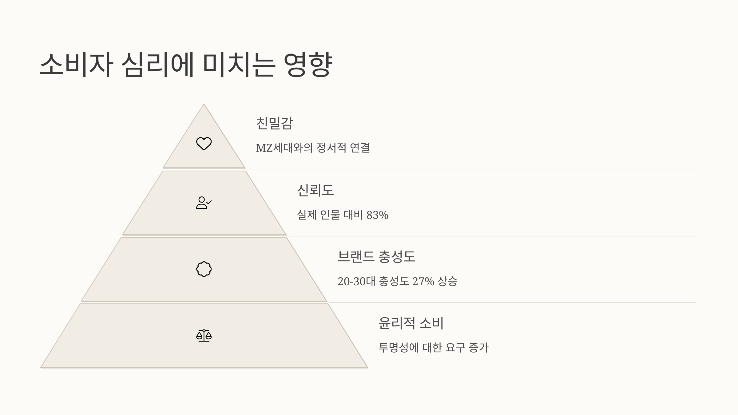 심리학적으로 봤을 때도, 브랜드가 소비자에게 주는 ‘인지된 인간성’은 매우 중요해요. 완전히 가짜인 존재지만, 그 캐릭터가 보여주는 언행과 가치관은 현실의 사람처럼 소비자에게 영향을 줄 수 있어요.