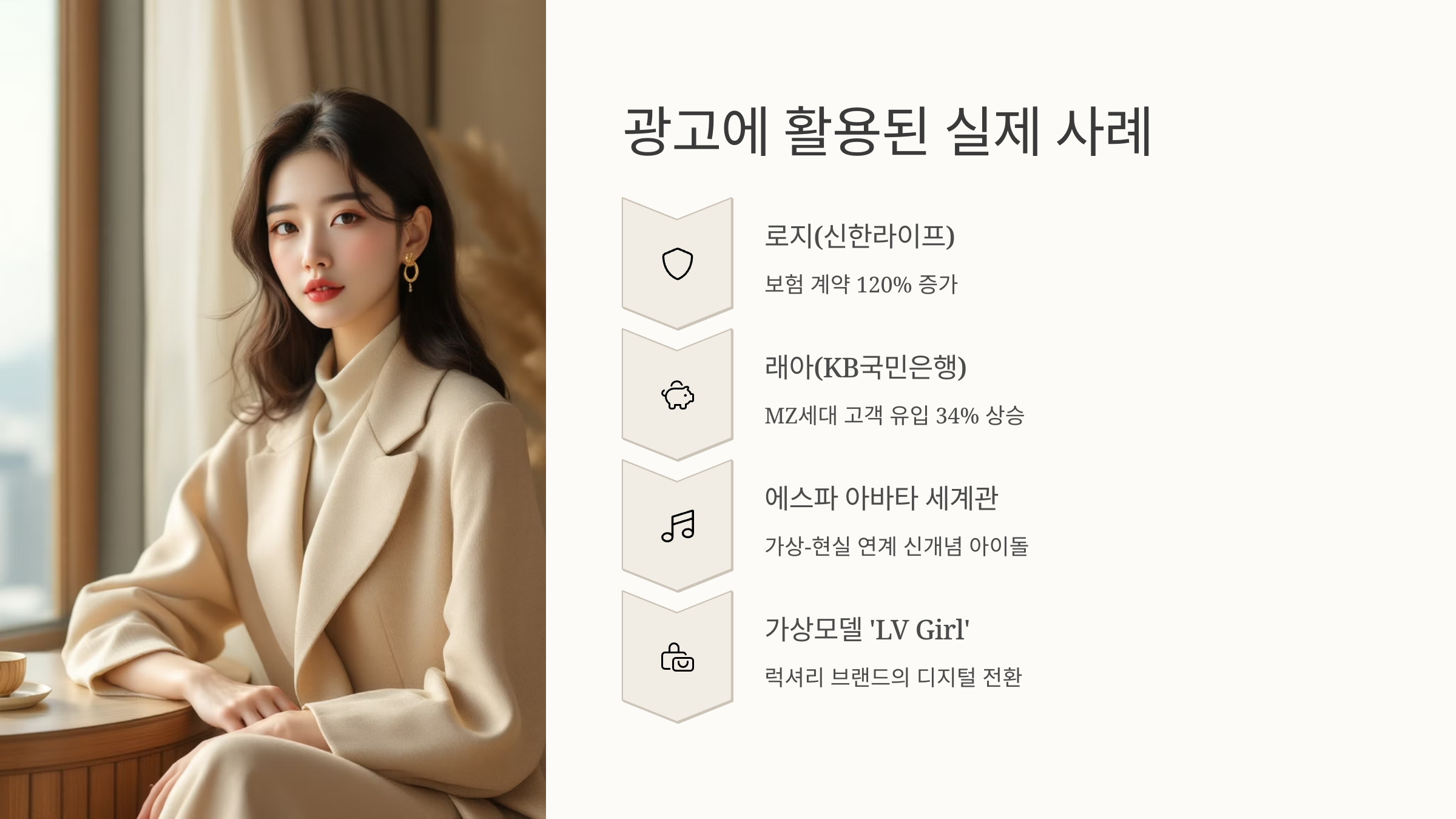 대표적으로 ‘로지(ROZY)’는 신한라이프 광고 모델로 등장하면서 큰 주목을 받았어요. 광고 이후 브랜드 인지도는 물론, MZ세대와의 감성적 연결까지 가능해졌어요. “미래를 말하는 보험”이라는 메시지와 가상인간의 이미지가 찰떡이었죠.