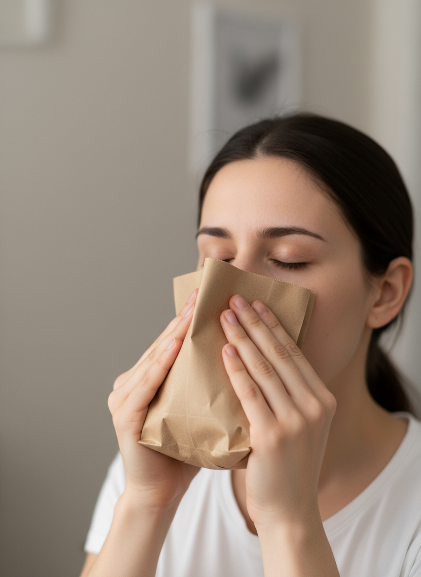 - 종이봉투 호흡: 코와 입을 종이봉투로 감싸고 내가 뱉은 숨을 다시 들이마십니다. 혈중 이산화탄소 농도가 높아지면 뇌가 횡격막 진정 신호를 보냅니다.