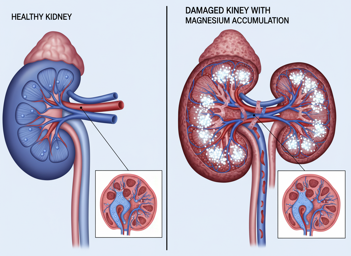 이 부분이 오늘 칼럼의 핵심입니다. 건강한 사람이라면 과잉 섭취된 마그네슘을 신장(콩팥)을 통해 소변으로 배출합니다. 우리 몸의 필터가 정상 작동하기 때문입니다. 하지만 신장 기능이 떨어진 분들은 이야기가 완전히 다릅니다. 배출되지 못한 마그네슘이 혈액 속에 그대로 쌓이게 되는데, 이는 마치 배수구가 막힌 싱크대에 물을 계속 틀어놓는 것과 같습니다.
