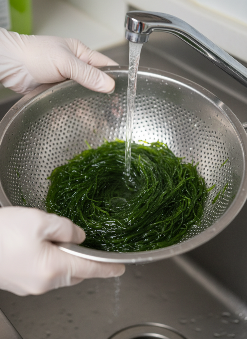 매생이는 가느다란 결 사이에 불순물이 섞여 있을 수 있으니, 엷은 소금물에 흔들어 씻어낸 뒤 체에 밭쳐 물기를 빼주세요.