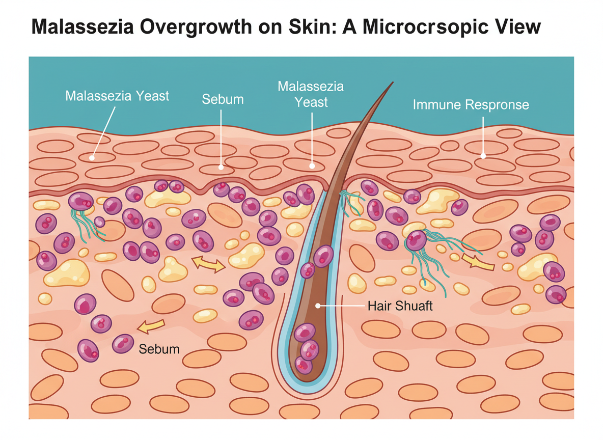 비듬균(말라세지아)은 누구에게나 있지만, 두피 환경이 습하고 기름지면 급격히 증식하여 가려움증과 염증을 유발합니다. 두피를 항상 뽀송하게 유지하는 것이 기본이에요!