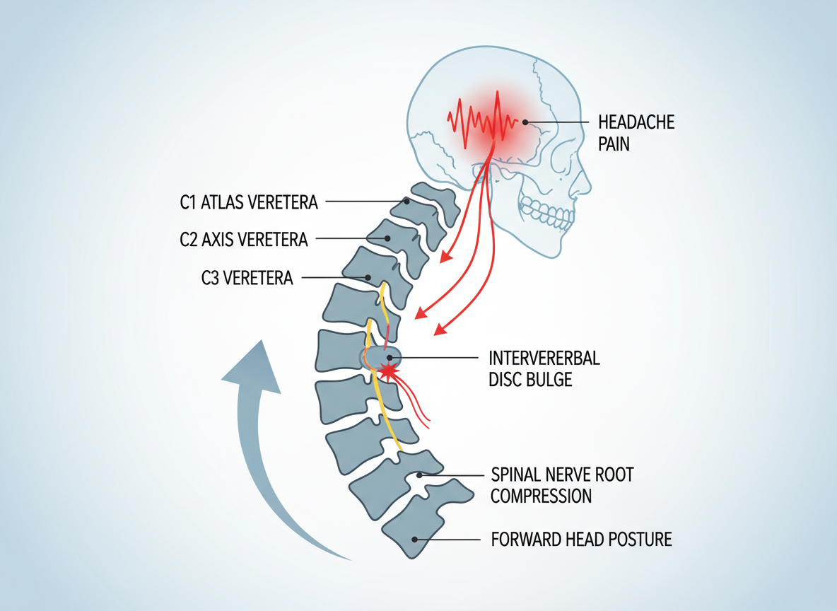 마지막으로 살펴볼 원인은 목에서 시작되는 '경추성 두통'입니다. 사실 머리가 아픈데 원인이 목에 있다는 게 언뜻 이해가 안 가실 수도 있어요. 하지만 우리 목 뼈(경추) 주변의 신경은 머리 신경과 아주 밀접하게 연결되어 있습니다. 마치 한 회사에서 부서 간에 직통 전화가 연결된 것처럼 말이죠. 목 관절에 염증이 생기거나 디스크가 신경을 건드리면, 그 통증 신호가 머리로 잘못 전달되어 두통으로 나타납니다.