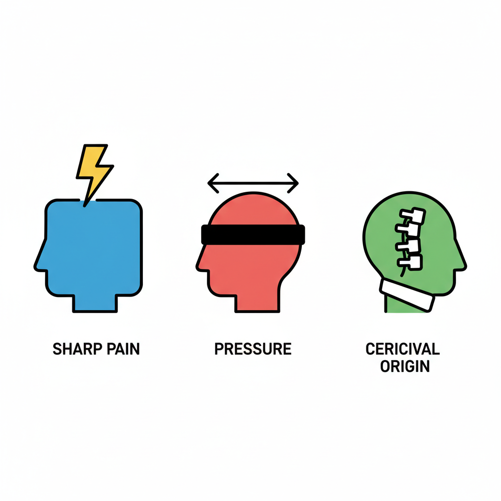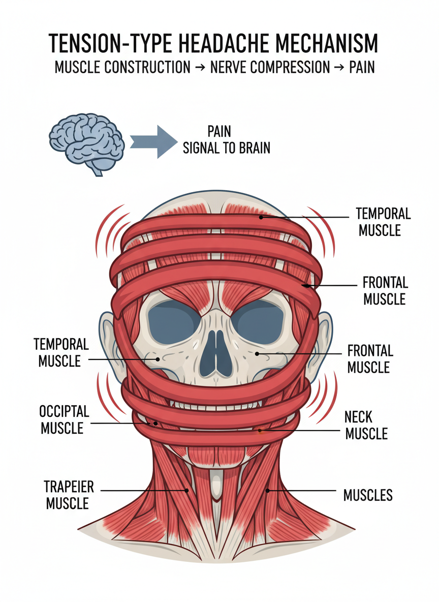 두 번째 용의자는 바로 현대인의 고질병, '긴장성 두통'입니다. 스트레스를 많이 받은 날, 머리에 아주 꽉 끼는 수영모자나 띠를 두른 것 같은 답답함을 느껴보신 적 있으시죠? 이게 바로 근육이 과도하게 긴장해서 생기는 통증입니다. 후두신경통이 '전기 충격'이라면, 긴장성 두통은 '묵직한 압박'에 가깝지만, 근육이 뭉치다 못해 경련을 일으키면 찌릿한 느낌을 동반하기도 합니다.