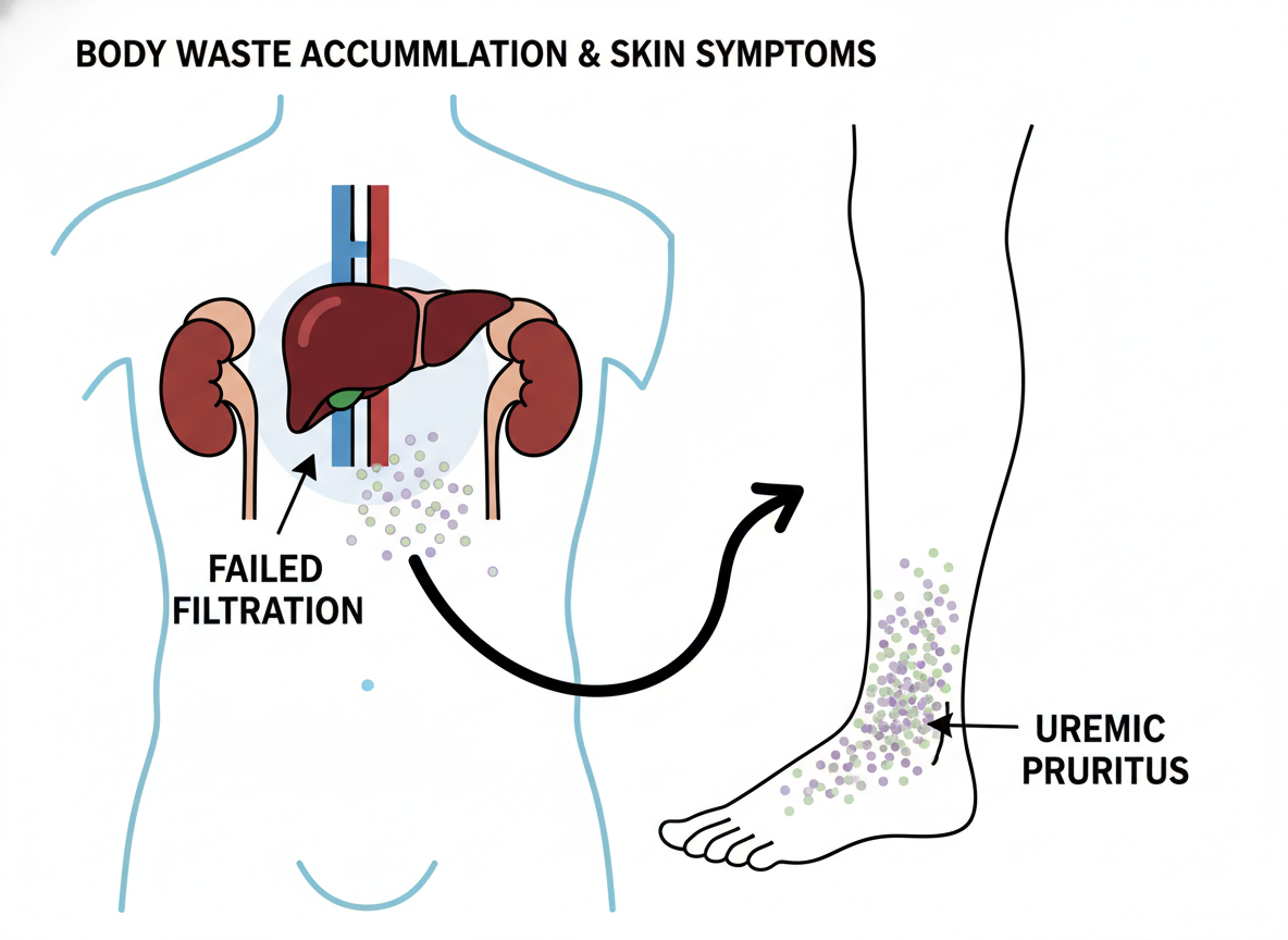 - 신장 질환 (요독성 가려움증): 신장 기능이 저하되면 체내 노폐물이 제대로 배출되지 않아 피부에 축적될 수 있습니다. 이 노폐물들이 가려움증을 유발하는데, 발바닥뿐만 아니라 전신에 나타나기도 해요.