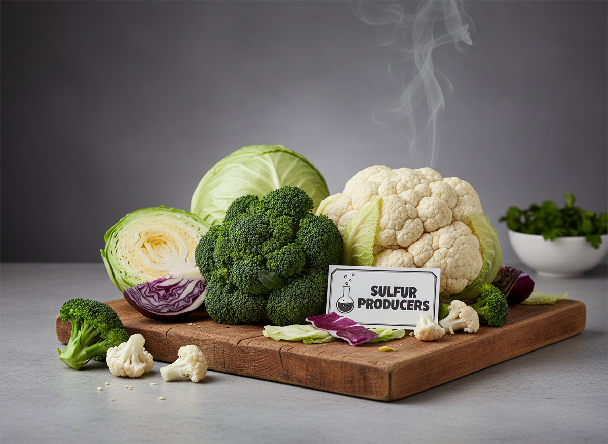 - 십자화과 채소: 브로콜리, 양배추, 케일 등은 건강에는 좋지만 황 화합물을 생성합니다.