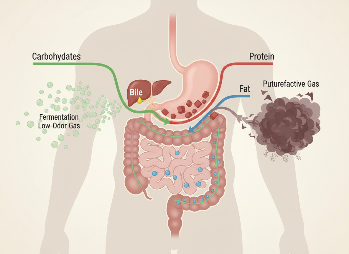 소화기관에서 다 흡수하지 못한 단백질 찌꺼기가 대장으로 내려가면, 장내 유해균이 이를 분해하며 '부패' 과정을 거치게 됩니다. 이때 발생하는 가스가 바로 우리가 걱정하는 그 악취의 정체입니다.