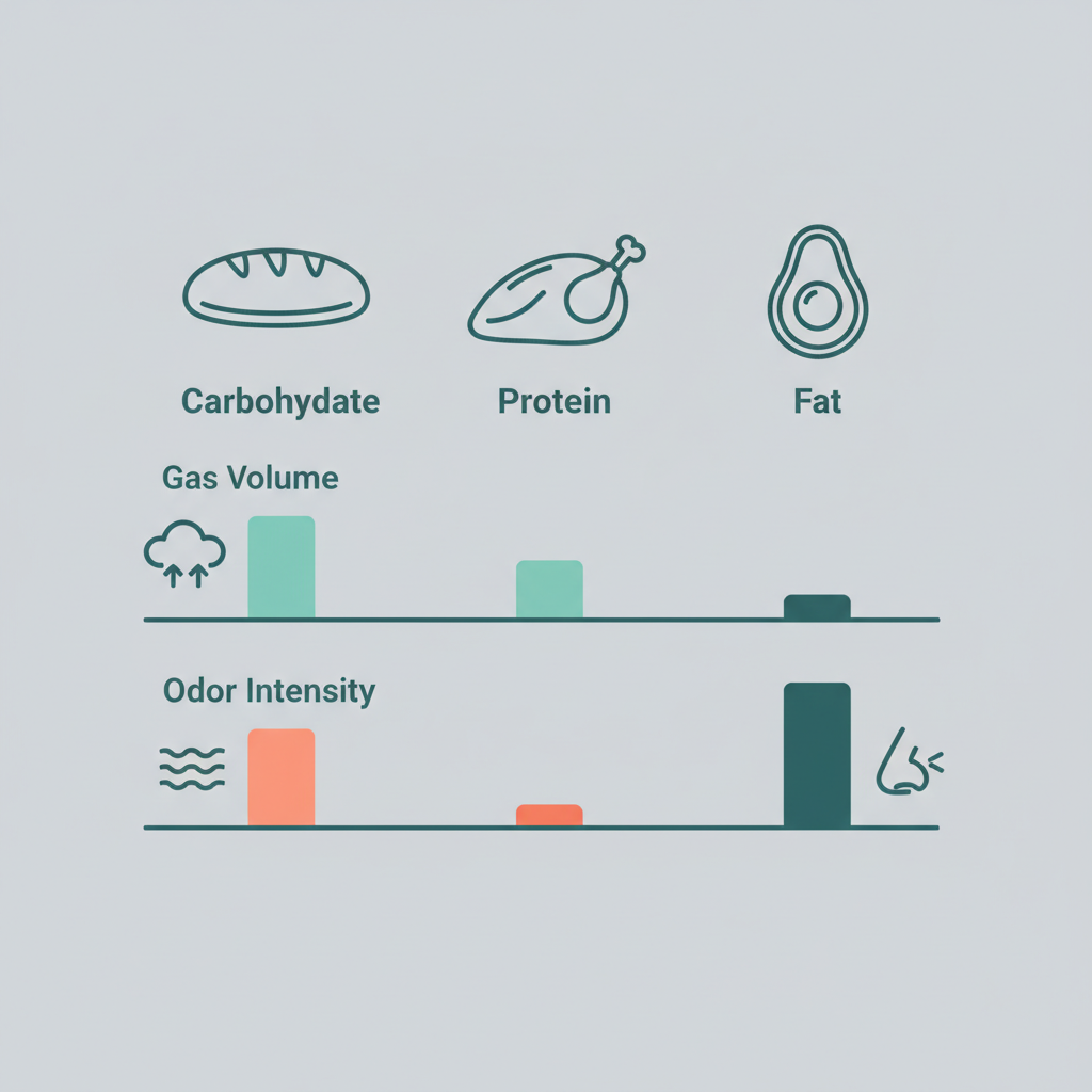 | 탄수화물 중심 | 고구마, 콩, 보리밥 | 양이 많고 소리가 크지만 냄새는 적음 |
