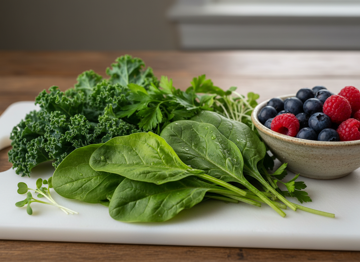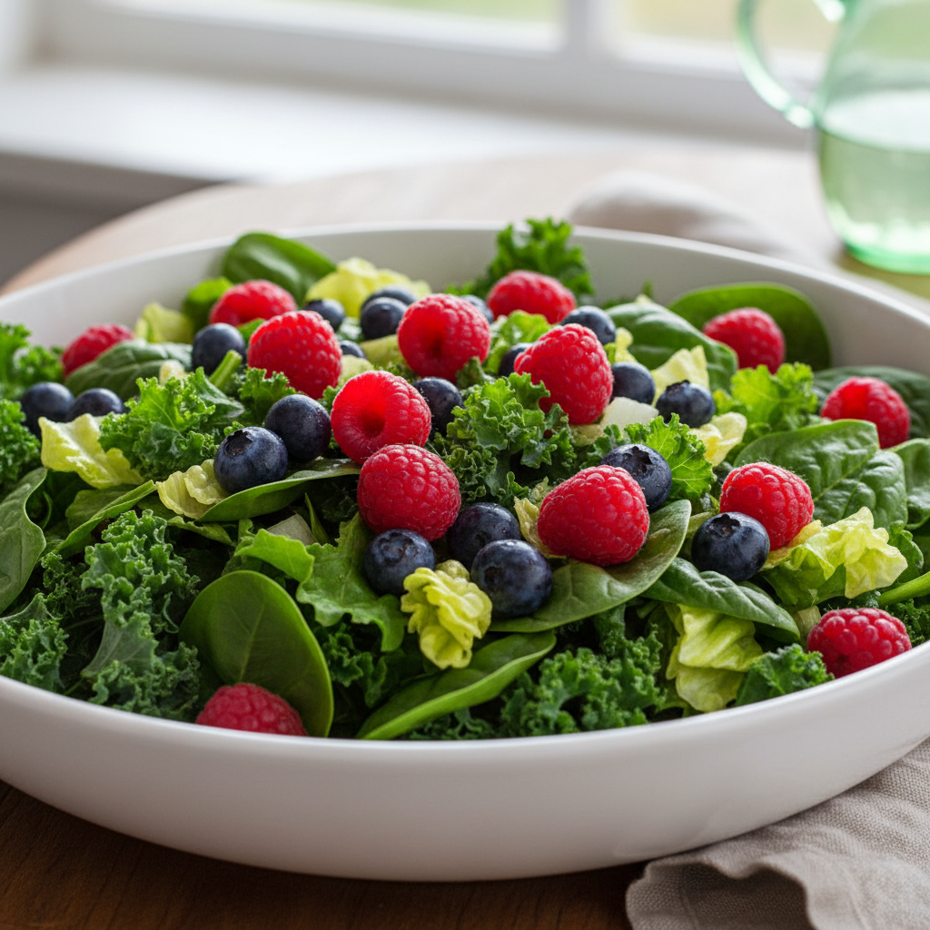 시금치, 케일 같은 녹색 잎채소와 블루베리, 라즈베리 같은 베리류는 항산화 성분과 비타민이 풍부해서 신진대사를 활발하게 하고 지방 연소를 돕는 역할을 해요. 샐러드나 스무디에 넣어 매일 섭취하면 정말 좋아요.