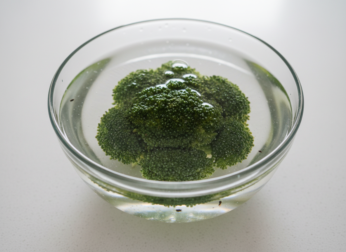 브로콜리 꽃봉오리에는 먼지와 벌레가 숨어있을 수 있습니다. 물에 식초나 소금을 풀어 10~20분간 거꾸로 담가 두어 충분히 세척한 뒤 조리하세요.