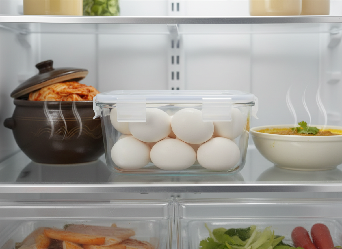 온도가 오르락내리락하면 계란 내부에 습기가 찰 수 있고, 이는 세균 번식의 최적 조건을 만들어줍니다. 삶은 계란은 날계란보다 변질 속도가 훨씬 빠르기 때문에 온도 변화가 적은 냉장고 안쪽 깊숙한 곳, 혹은 신선 야채 칸에 보관하는 것이 정석입니다. 이때 그냥 넣어두기보다는 밀폐 용기에 담아 보관하면 냉장고 속 다른 음식 냄새가 배는 것도 막고 수분 증발도 방지할 수 있어 일석이조의 효과를 누릴 수 있습니다.