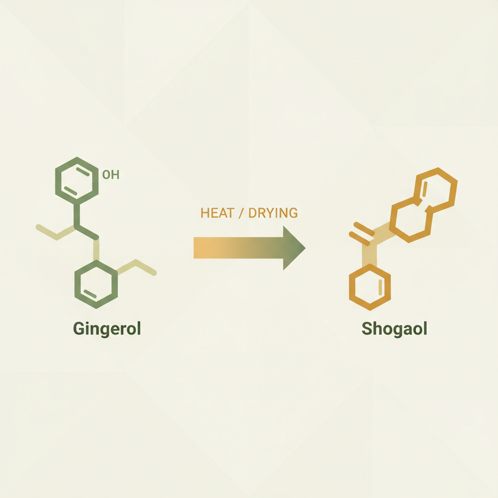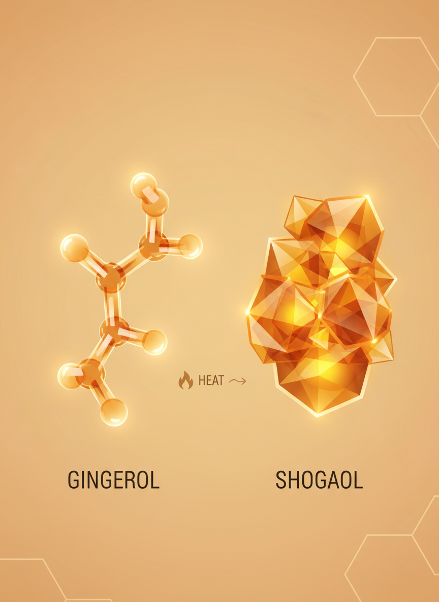 진저롤은 신선한 생강에 풍부하며 혈액 순환을 돕고 항균 작용을 합니다. 반면 생강을 말리거나 열을 가하면 진저롤이 쇼가올로 변하게 되는데, 쇼가올은 진저롤보다 항염증 및 항산화 효과가 더욱 강력한 것으로 알려져 있어요. 우리가 따뜻하게 끓인 생강차를 마실 때 몸이 더 뜨거워지는 이유도 바로 이 때문입니다.