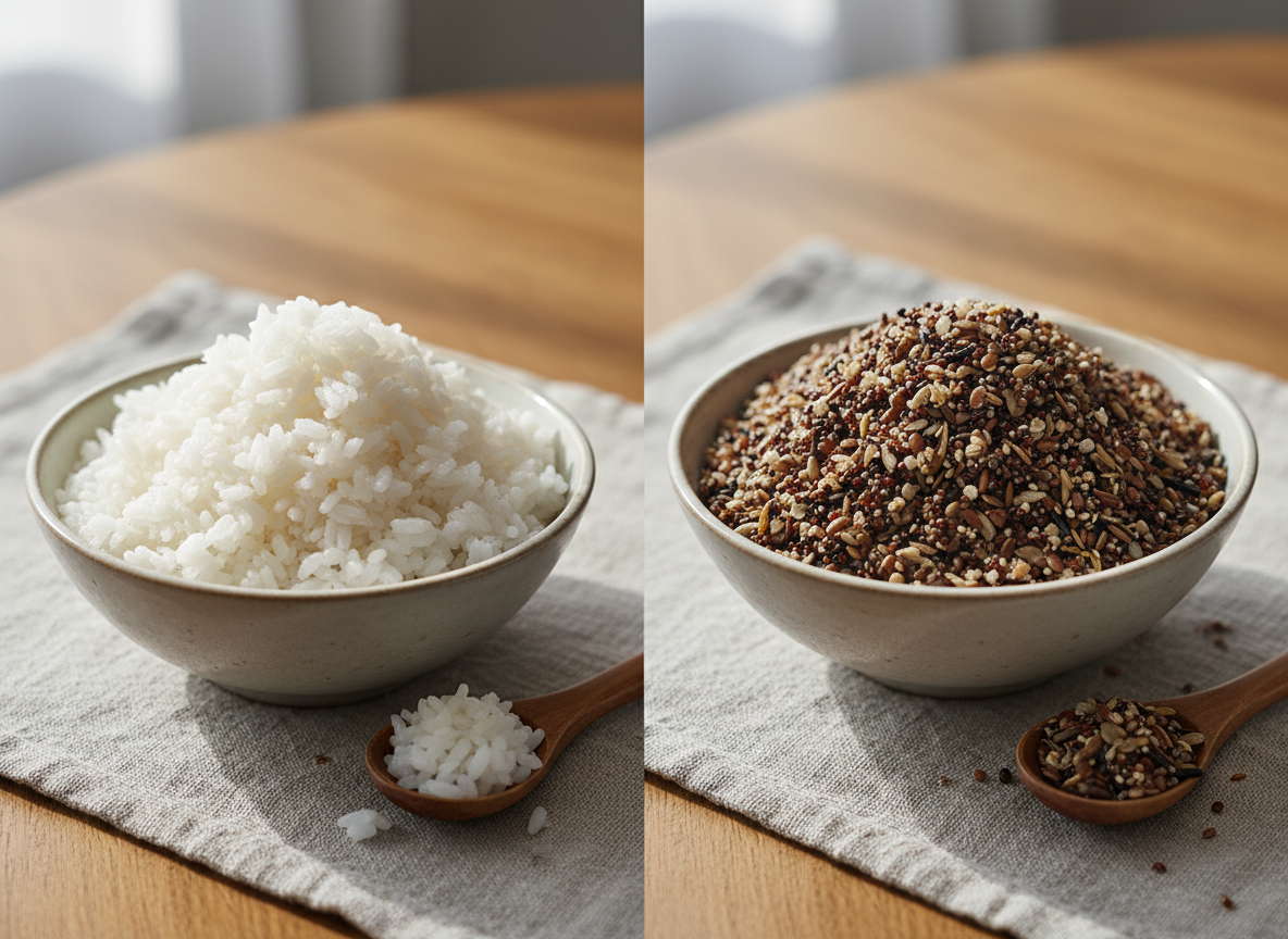 - 정제 탄수화물 멀리하기: 흰쌀밥, 빵, 면 종류는 흡수가 너무 빨라 혈당을 급격히 높입니다. 잡곡밥이나 통밀빵으로 대체해 보세요.
