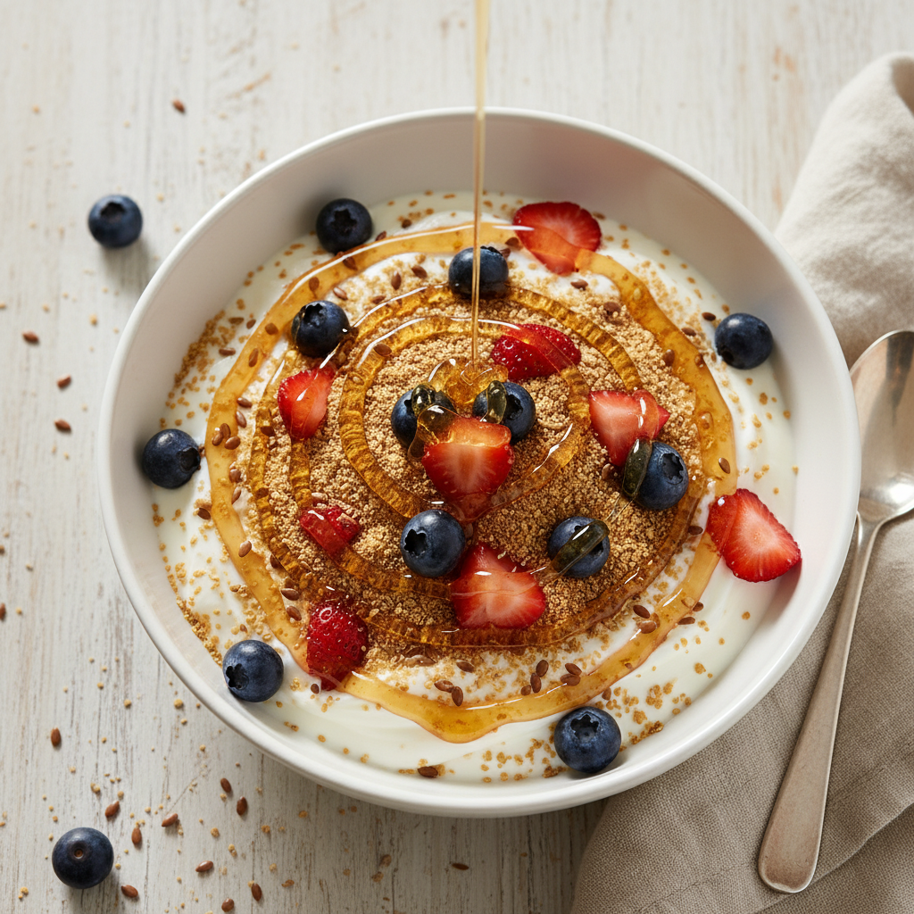 - 요거트 토핑: 플레인 요거트에 아마씨 가루 한 스푼과 꿀을 섞으면 고소함이 배가 됩니다.