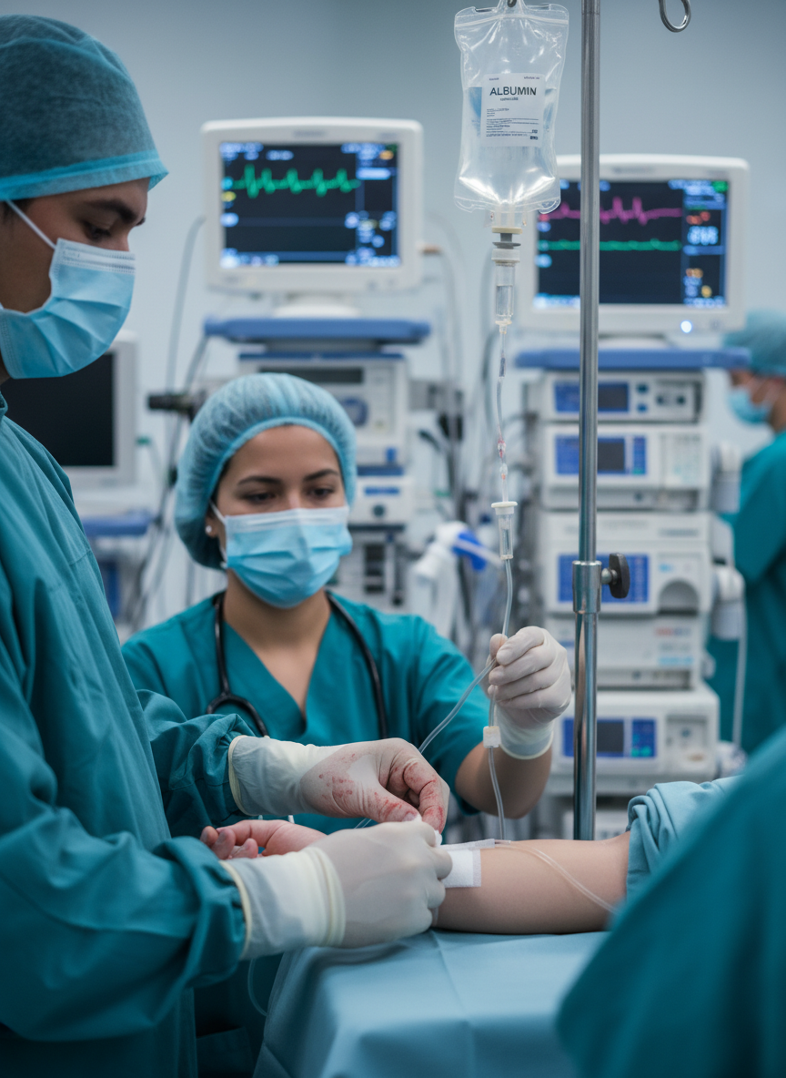 - 심한 화상: 혈관 손상으로 인해 체액과 알부민이 빠져나가 쇼크 위험이 있을 때 혈액량 유지를 위해 필요합니다.