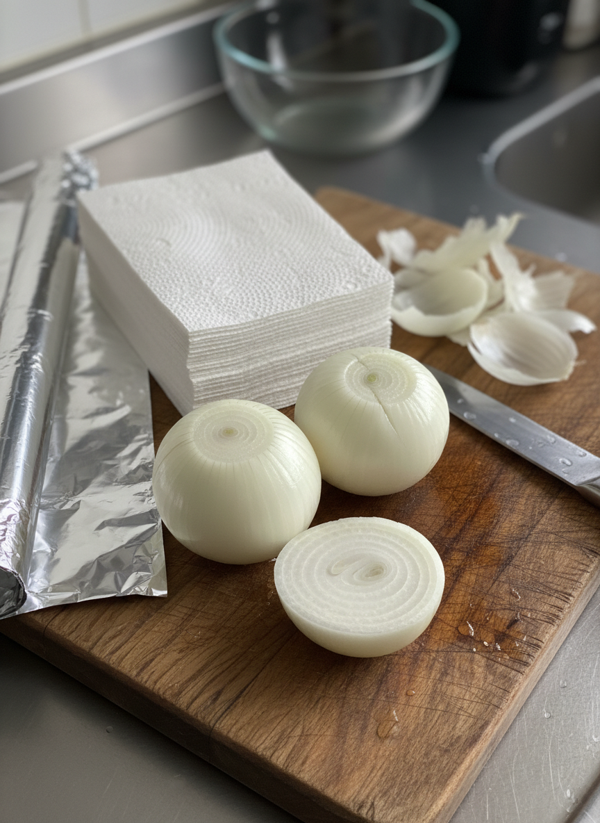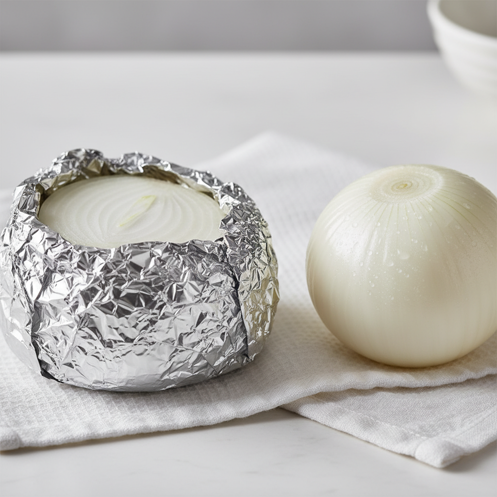 요리하고 남은 깐 양파, 혹은 껍질 까기가 귀찮아 미리 손질해 둔 양파는 어떻게 해야 할까요? 랩이나 비닐봉지에 대충 넣어두면 금세 표면이 끈적거리고 냄새가 냉장고 전체를 지배하게 됩니다. 이때는 '알루미늄 호일'이 정답입니다.