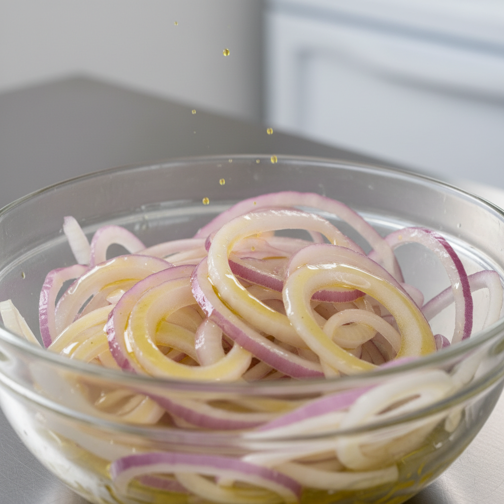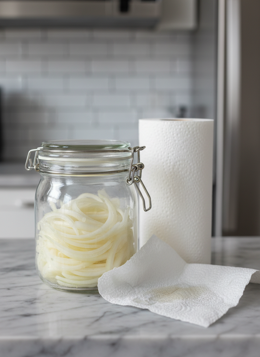 껍질을 벗긴 양파의 물기를 키친타월로 완벽하게 제거한 뒤, 호일로 빈틈없이 꽁꽁 감싸주세요. 호일은 빛과 공기를 랩보다 훨씬 강력하게 차단하여 양파의 산화를 막고, 수분이 날아가는 것을 억제합니다. 마치 양파에게 우주복을 입혀 외부 환경과 격리하는 것과 같습니다. 이렇게 보관하면 놀랍게도 3주에서 한 달 가까이 갓 깐 것 같은 아삭함을 유지합니다. 꺼낼 때마다 느껴지는 단단한 질감에 감탄하게 되실 겁니다.