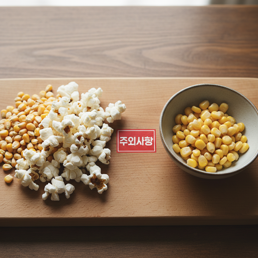 ⚠️ 소화 문제: 옥수수의 질긴 껍질과 풍부한 식이섬유는 소화가 어려운 분들에게 부담이 될 수 있습니다. 소화 기능이 약하다면 섭취량을 조절하거나 잘게 다져서 드세요.
