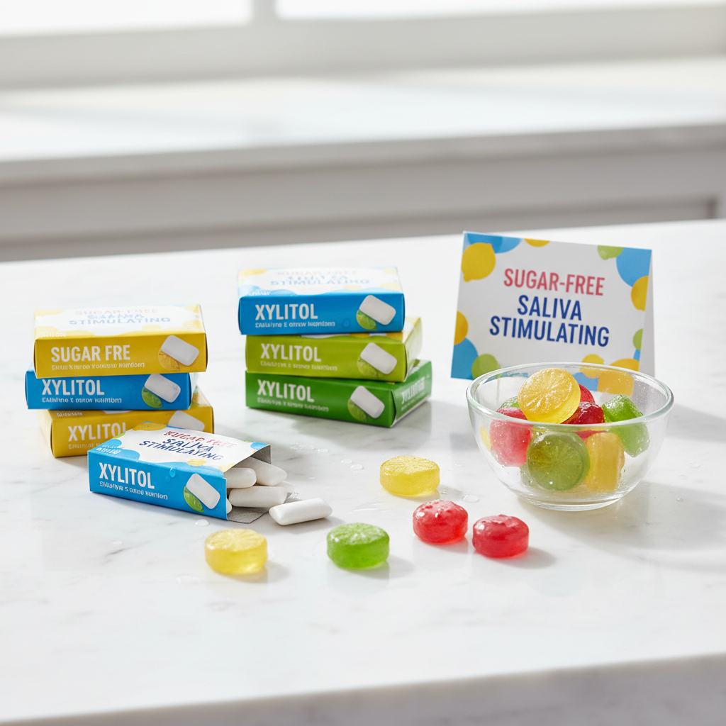 - 무설탕 껌이나 캔디: 자일리톨이 함유된 껌을 씹으면 침샘이 자극되어 분비량이 늘어납니다.