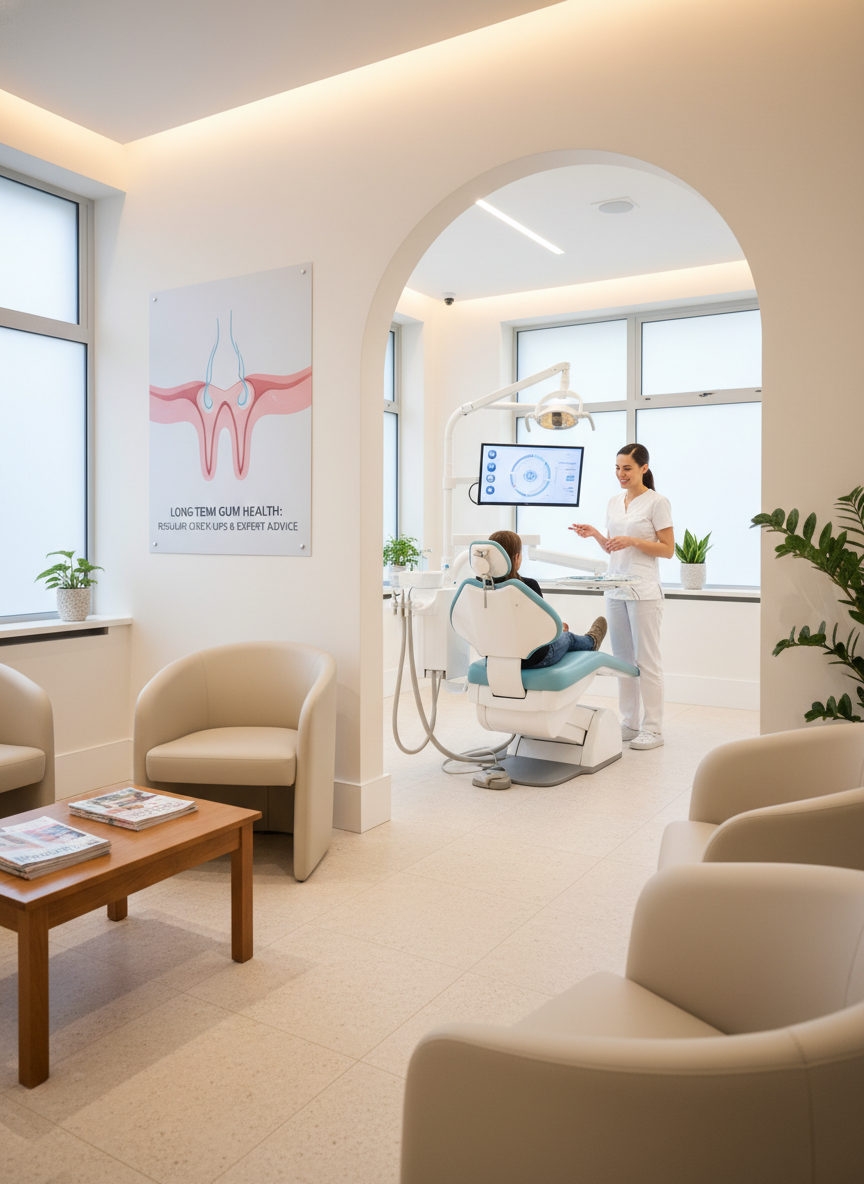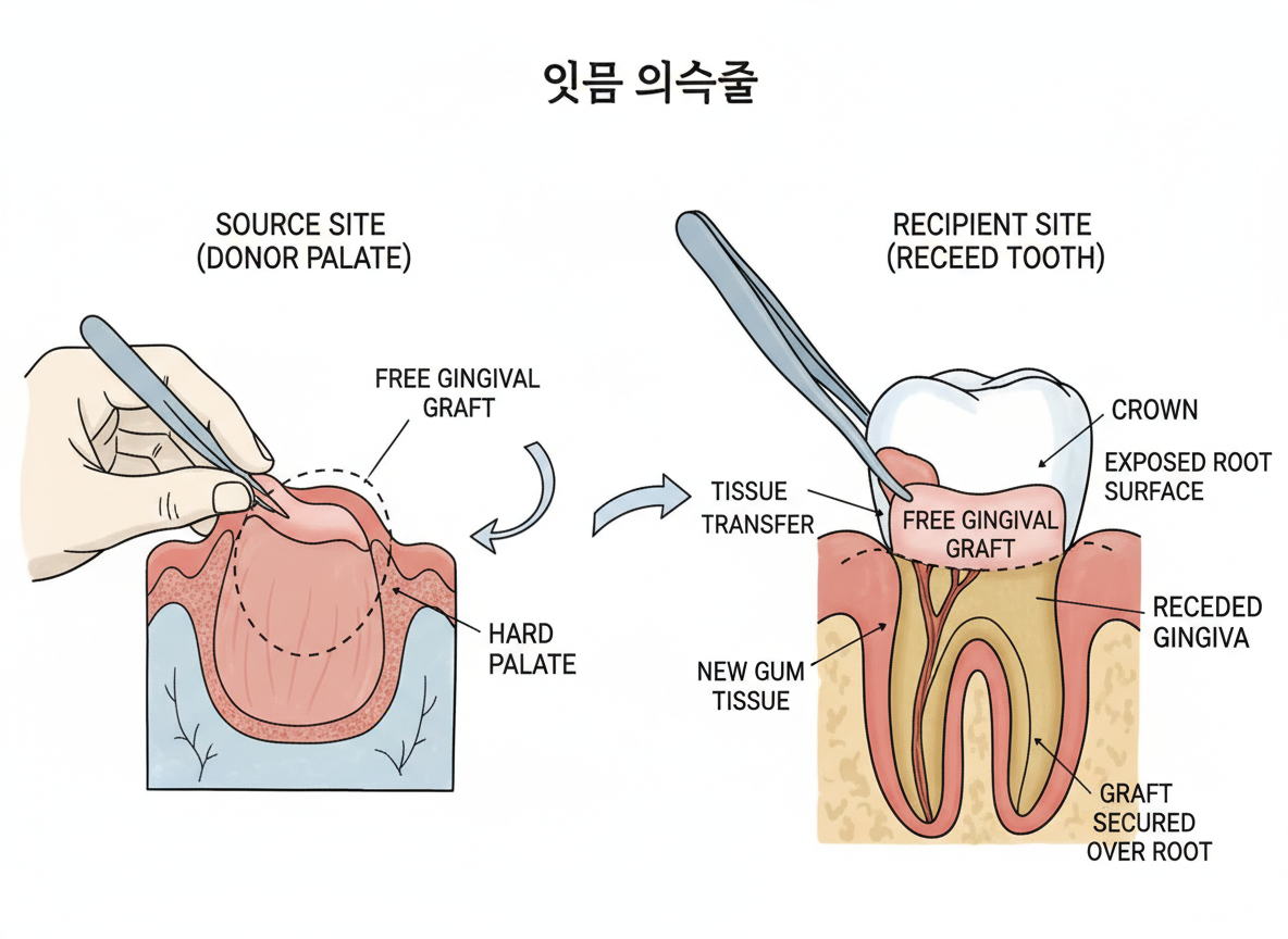 - 잇몸 이식술: 잇몸이 너무 많이 퇴축되어 치아 뿌리가 과도하게 노출되고 미관상 심각한 문제가 생겼다면, 입천장 등에서 건강한 잇몸 조직을 떼어내어 이식하는 수술을 고려할 수 있습니다.