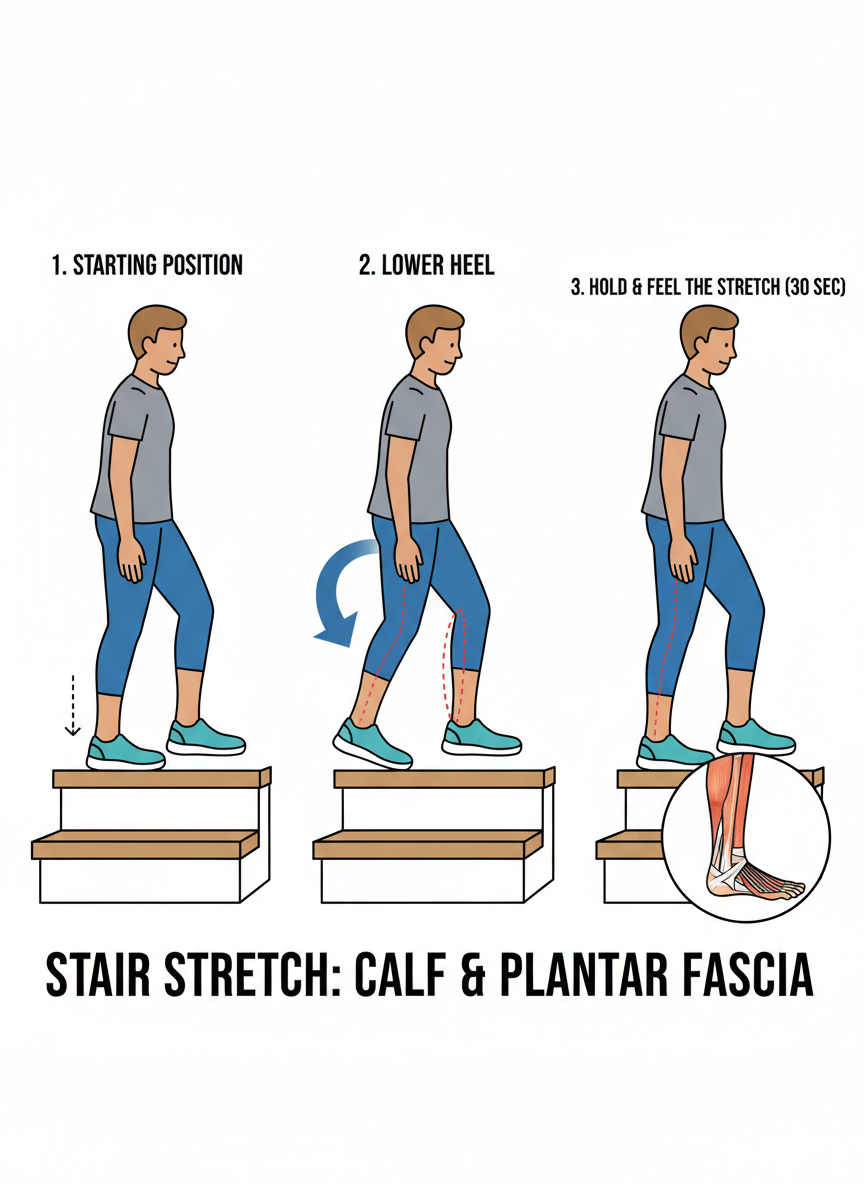 - 아침 스트레칭 루틴: 잠에서 깨자마자 침대에서 발가락을 몸 쪽으로 당겨 족저근막과 아킬레스건을 15초씩 3회 정도 스트레칭 해주세요. 첫 발을 내딛기 전에 꼭!