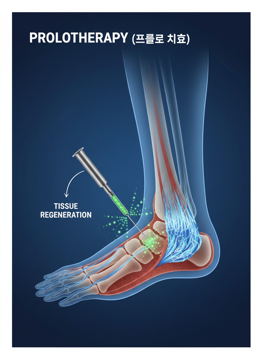 - 프롤로 치료 (인대 강화 주사): 손상된 인대나 힘줄 부위에 고농도 포도당 용액을 주사하여 조직의 증식을 유도하고 강화시키는 치료법입니다.