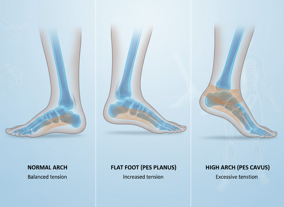 - 평발 또는 요족: 발의 아치 형태에 이상이 있으면 충격 흡수 능력이 떨어져 족저근막에 무리가 갈 수 있습니다.