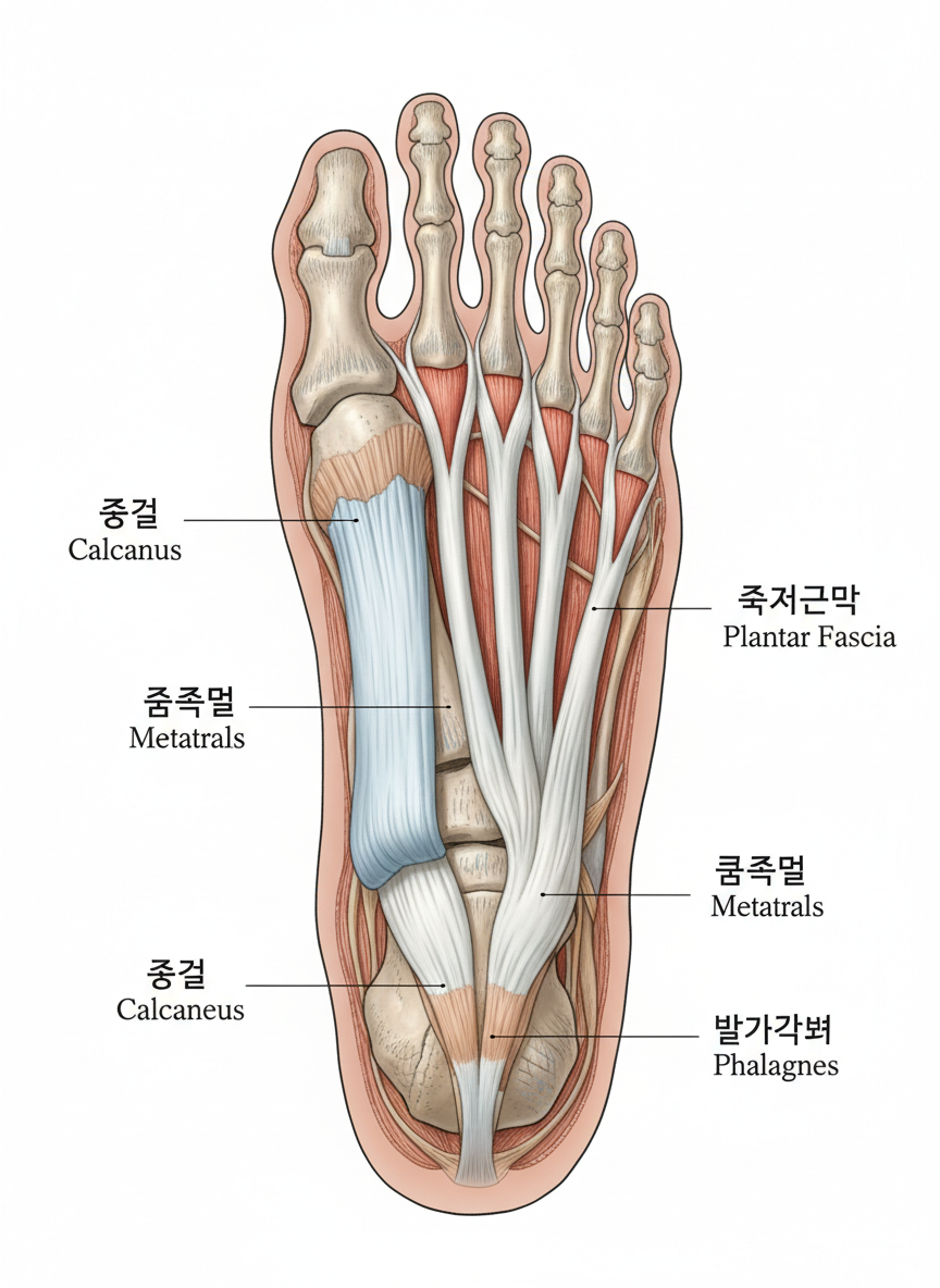 족저근막염은 발바닥의 아치를 지지하는 두꺼운 섬유띠인 족저근막에 염증이 생기거나 미세한 손상이 발생하는 질환이에요. 이 족저근막은 발에 가해지는 충격을 흡수하고, 발의 아치 형태를 유지하며, 우리가 걷거나 뛸 때 스프링처럼 발을 지지해주는 아주 중요한 역할을 합니다. 그런데 여기에 과도한 부하가 반복적으로 가해지면 염증이 생기면서 통증을 유발하는 거죠.