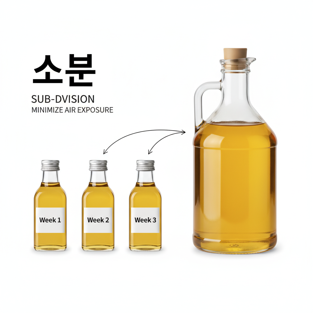 가장 이상적인 용기는 입구가 좁은 짙은 색의 유리병이나 도자기 재질입니다. 입구가 좁아야 공기와의 접촉면을 줄일 수 있고, 유리나 도자기는 화학적으로 안정적이라 기름과 반응하지 않습니다. 만약 대용량으로 구매하셨다면, 큰 통을 자주 여닫으며 산소와 접촉시키기보다는 작은 유리병(약 1~2주 사용 분량)에 소분하여 사용하는 것이 산패를 막는 가장 확실한 전략입니다. 소분할 때도 용기는 반드시 열탕 소독 후 물기를 바짝 말려서 사용해야 한다는 점, 잊지 마세요.