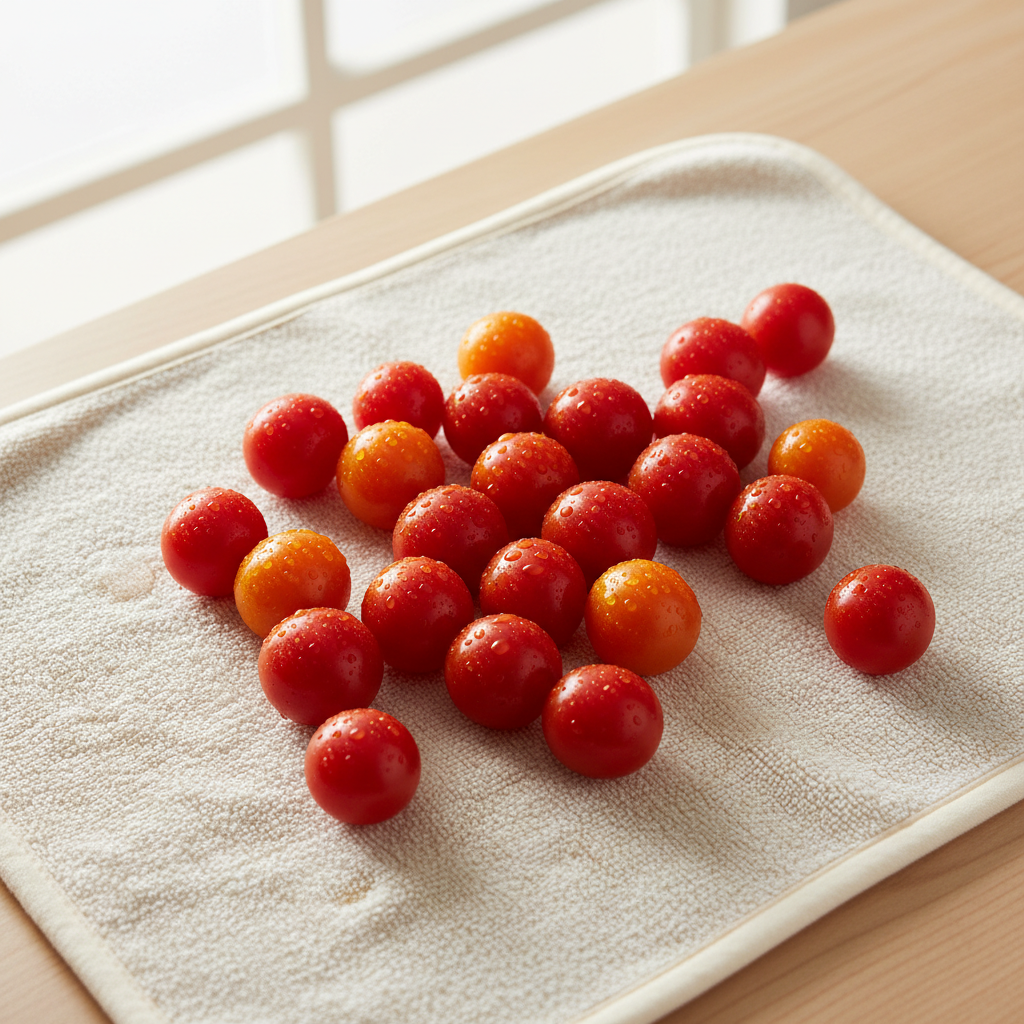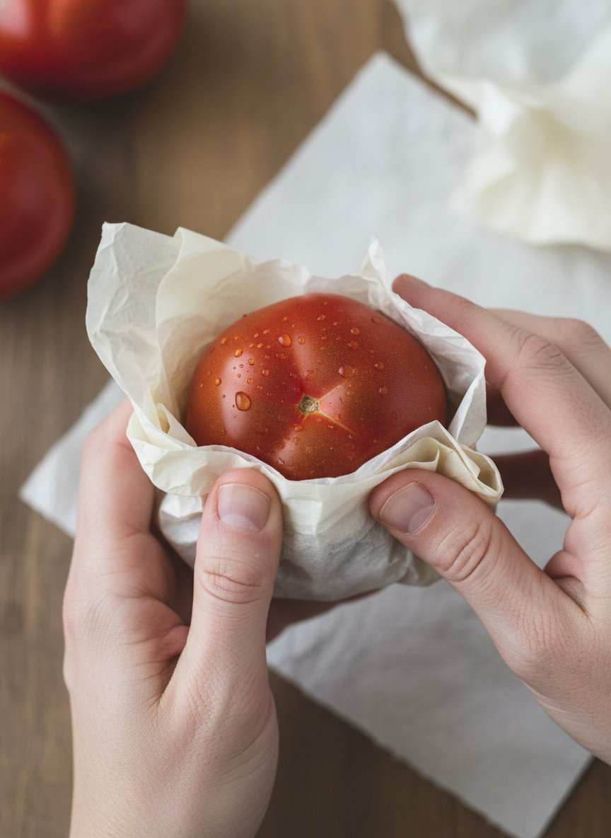 - 완전히 익은 완숙 토마토: 더 이상 익지 않도록 냉장 보관하는 것이 좋습니다. 이때는 수분 손실을 막기 위해 신문지나 키친타월로 한 알씩 감싸주는 것이 포인트예요.