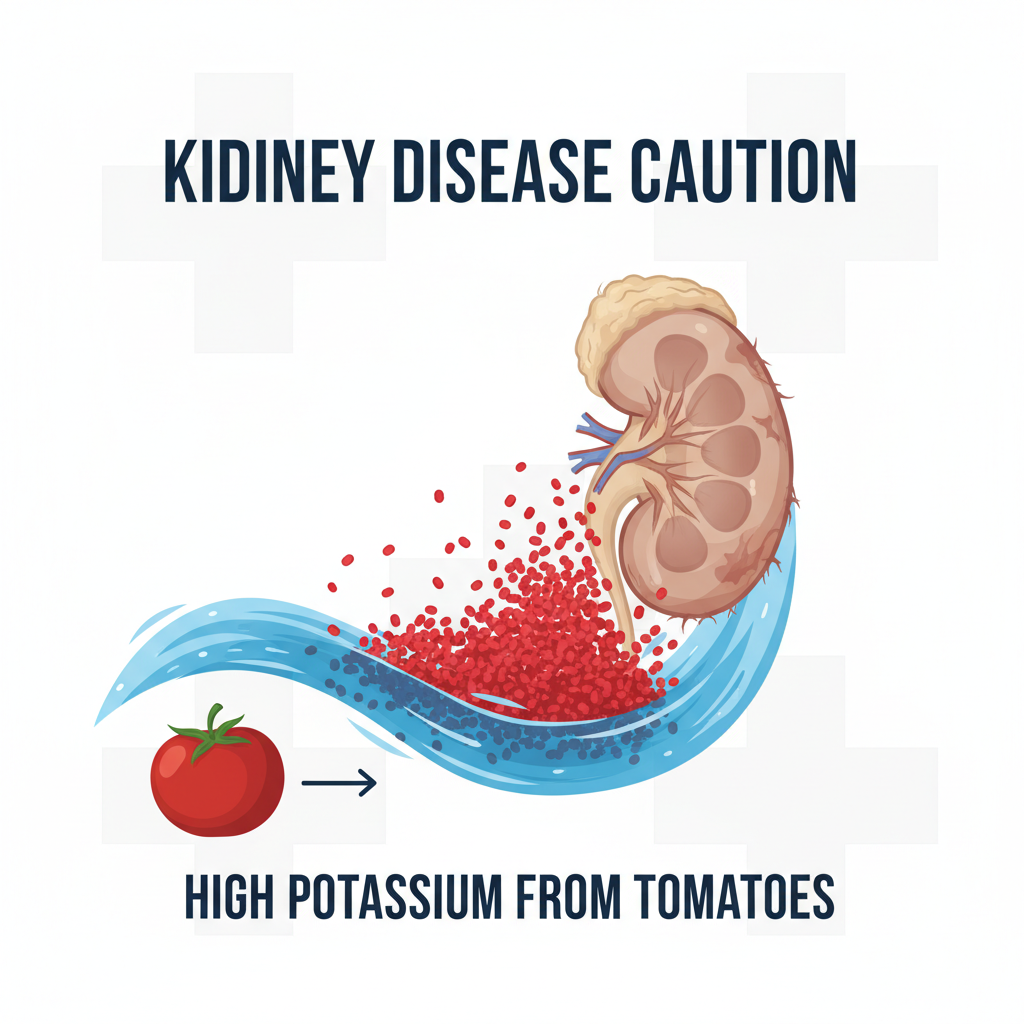 앞서 언급했듯 토마토의 풍부한 칼륨은 일반인에게는 고혈압 약이지만, 신장 기능이 저하된 만성 콩팥병 환자에게는 치명적일 수 있습니다. 신장은 칼륨을 배출하는 역할을 하는데, 기능이 떨어지면 체내 칼륨 농도가 높아져 부정맥이나 심장마비의 원인이 될 수 있습니다. 신장 관련 질환이 있다면 반드시 주치의와 상의하여 섭취량을 조절해야 합니다.
