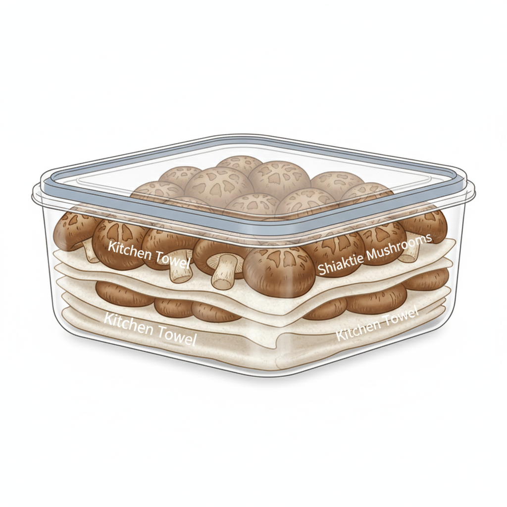 올바른 방법은 '개별 포장' 혹은 '층별 포장'입니다. 밀폐 용기 바닥에 키친타월을 도톰하게 깔아주세요. 마치 아기 기저귀를 갈아주듯, 버섯이 내뱉는 수분을 즉시 흡수할 수 있는 장치가 필요합니다. 그 위에 표고버섯의 갓이 위쪽을 향하도록, 혹은 기둥이 위로 가도록 놓는데, 핵심은 서로 짓눌리지 않게 하는 것입니다. 만약 양이 많다면 '키친타월 - 버섯 - 키친타월 - 버섯' 순서로 샌드위치처럼 쌓아주세요.