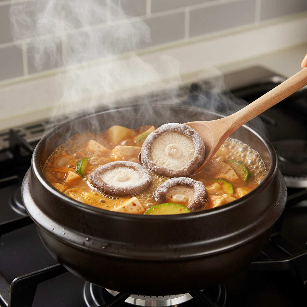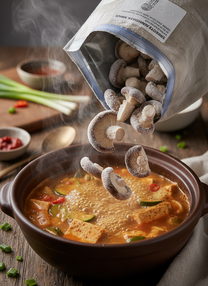 A: 냉동 버섯은 해동 과정을 거치지 않고 '언 상태 그대로' 끓는 찌개나 달궈진 프라이팬에 넣어야 합니다. 해동하면 수분이 빠져나와 식감이 망가지고 흐물거리게 됩니다.
