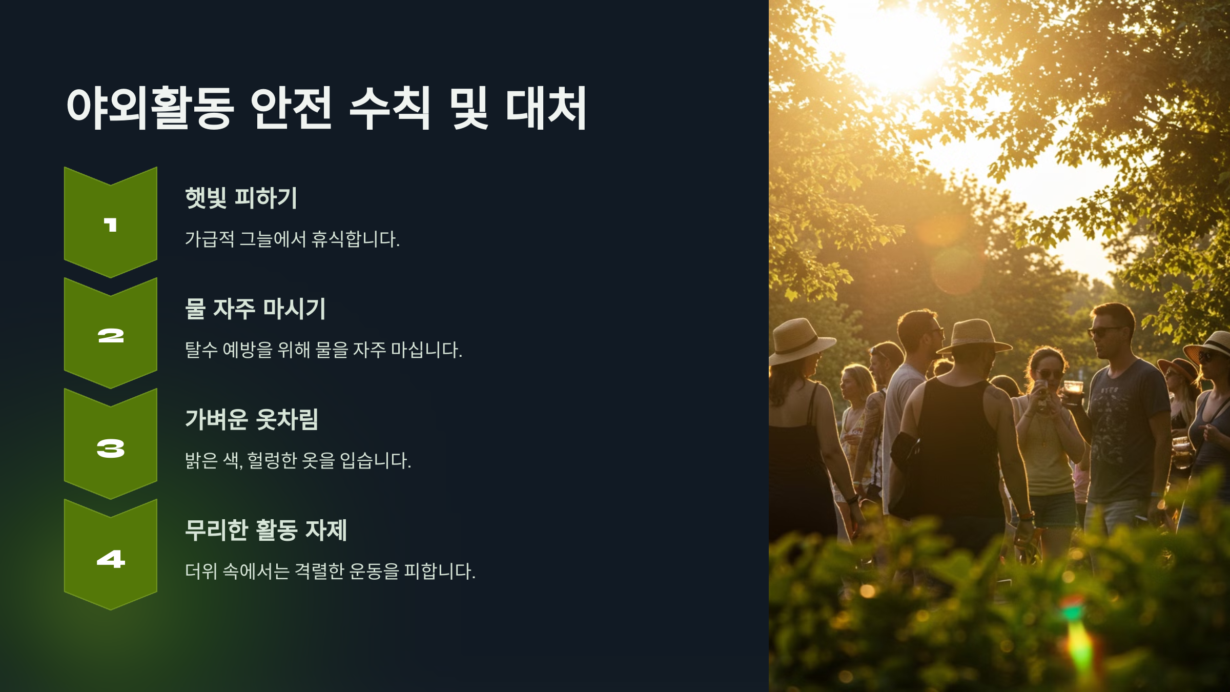 폭염 속 야외 활동은 열사병, 탈진, 일사병 등 건강에 심각한 위험을 초래할 수 있어요. 특히 한낮(오전 11시~오후 4시)에는 야외 활동을 최대한 피하는 것이 좋아요. 🌡️🔥