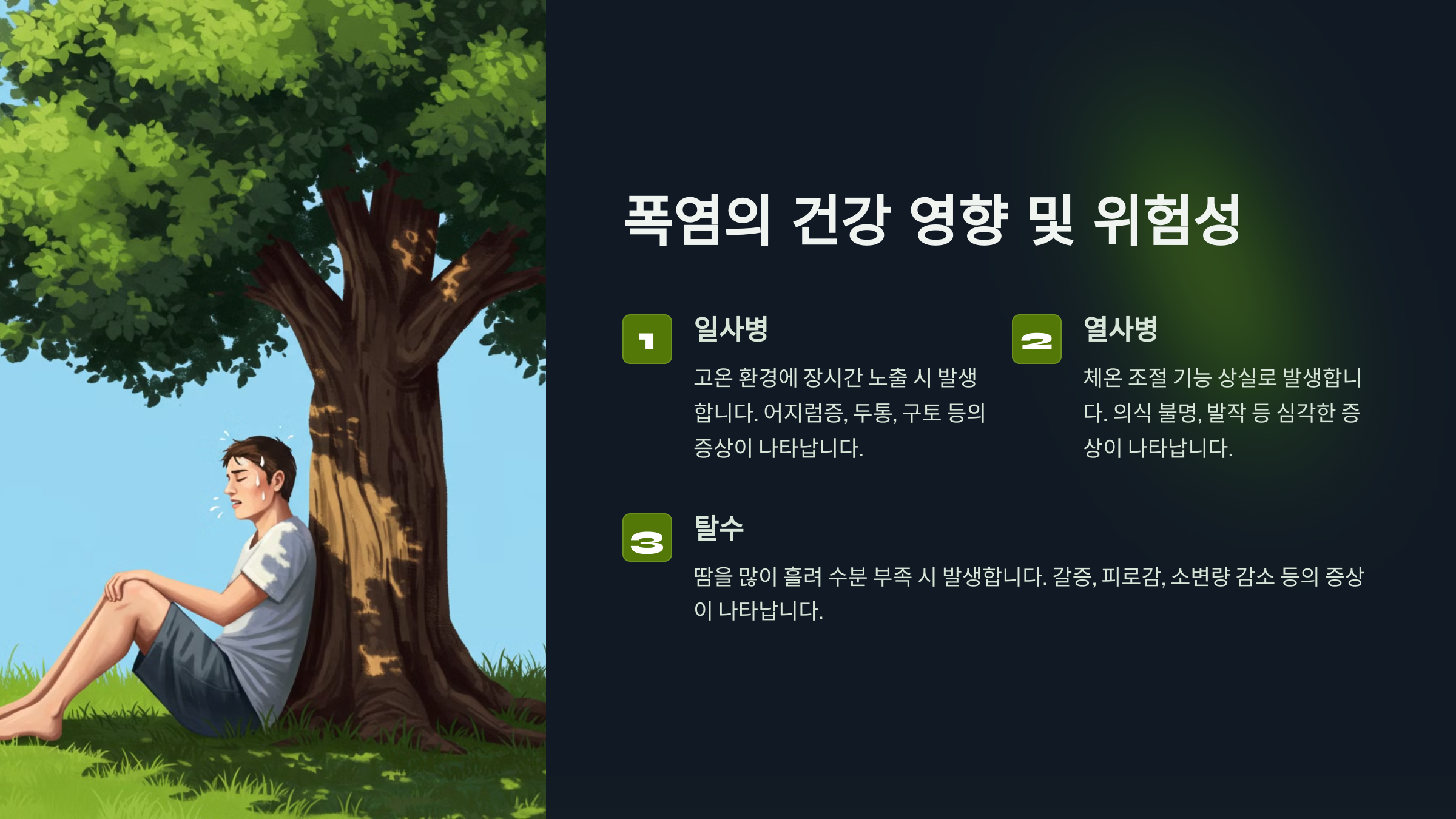 다음 섹션에서는 폭염으로 인한 건강 위험에 대해 알아볼게요. 🔥