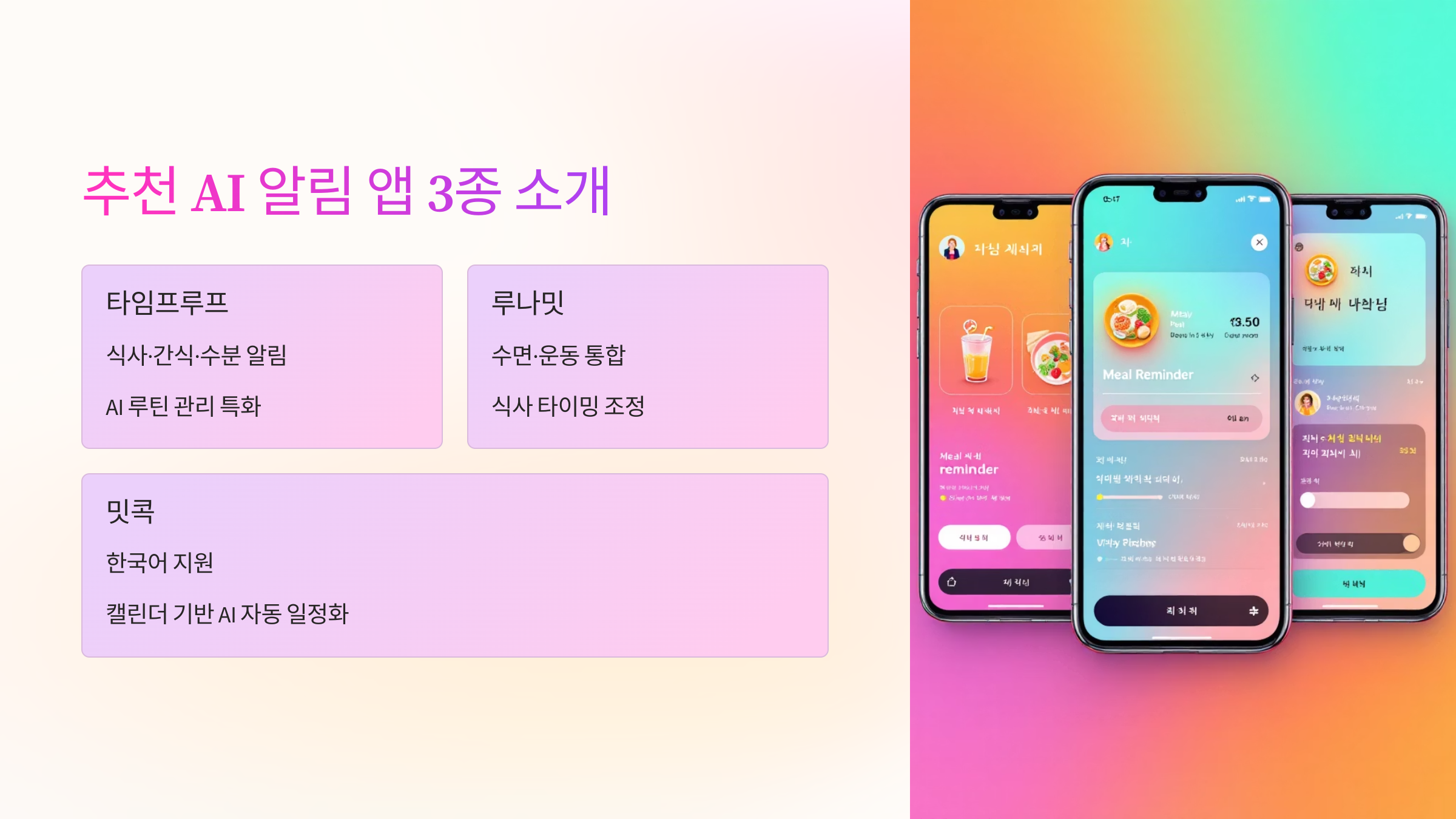 이럴 때 AI 기반 알림 시스템을 활용하면 일정 패턴을 분석해 자연스럽게 식사 시간을 제안해줘요. 사용자는 정해진 시간에 밥을 챙기기만 하면 되니까, 신경을 덜 쓸 수 있죠.