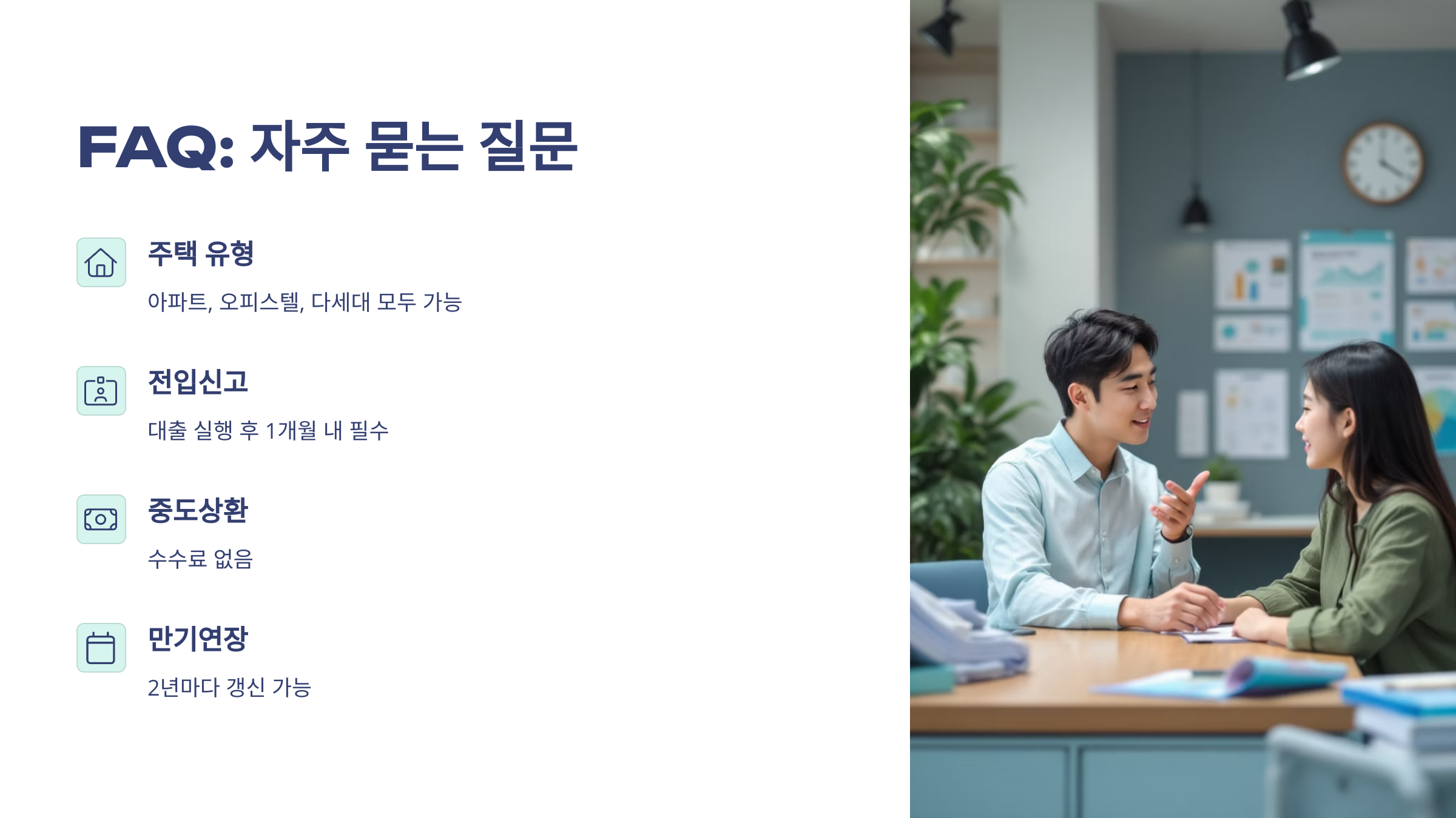 A8. 대출 실행 수수료나 인지세, 보증료가 추가될 수 있어요. 하지만 대부분 소액이고, 일부 상품은 정부나 지자체에서 지원해줘서 실부담은 낮은 편이에요.