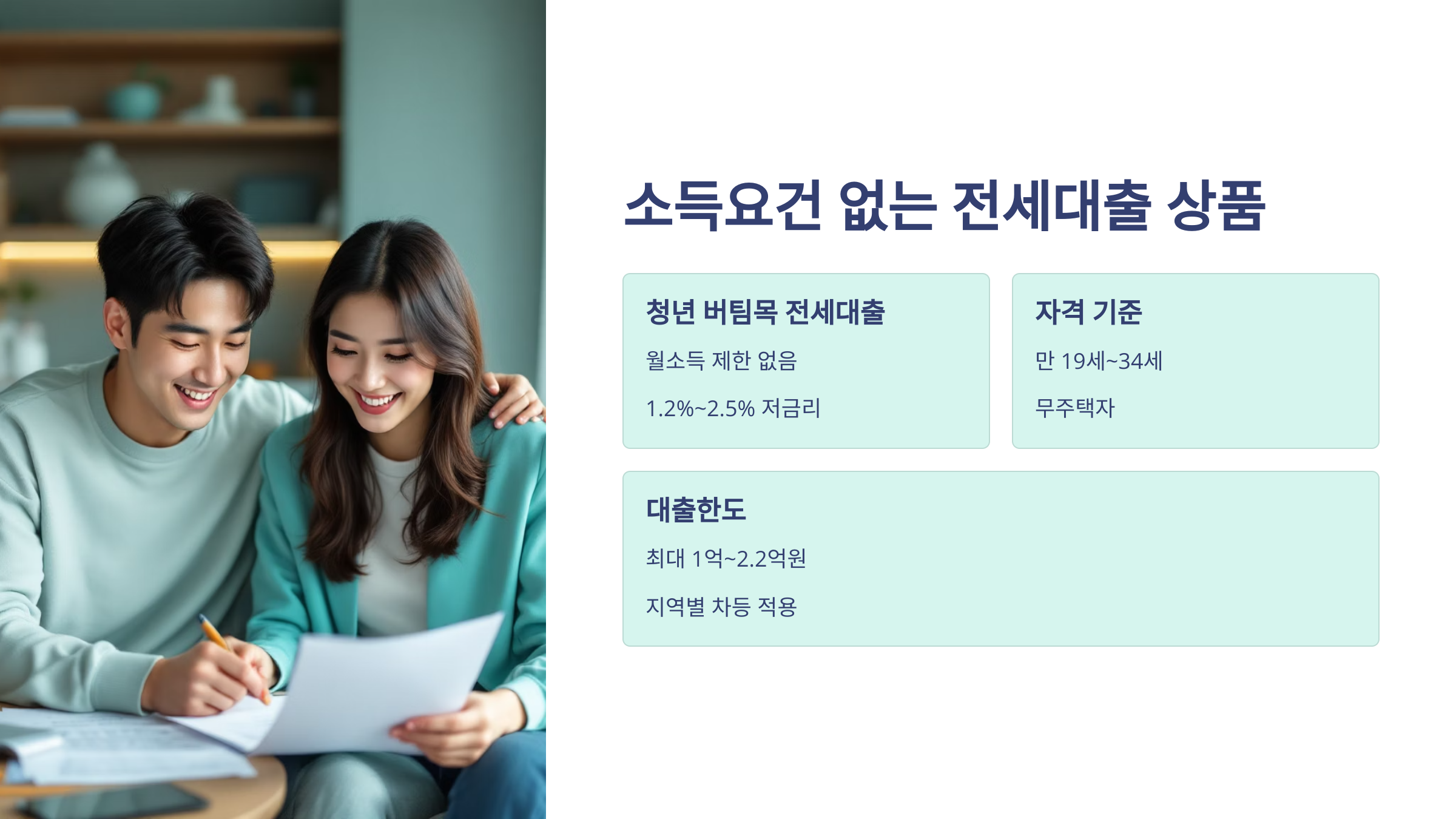 그렇지만 정책형 전세대출 중에는 소득요건이 완화되거나 아예 없는 상품도 있어요. 이건 청년 주거안정을 목적으로 국가가 보증을 서주는 구조라 가능한 거예요.