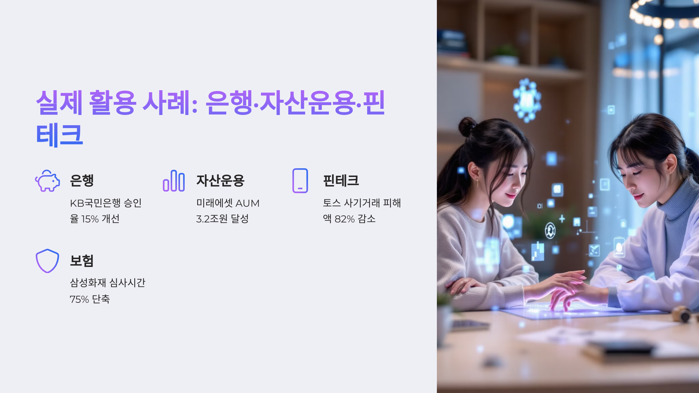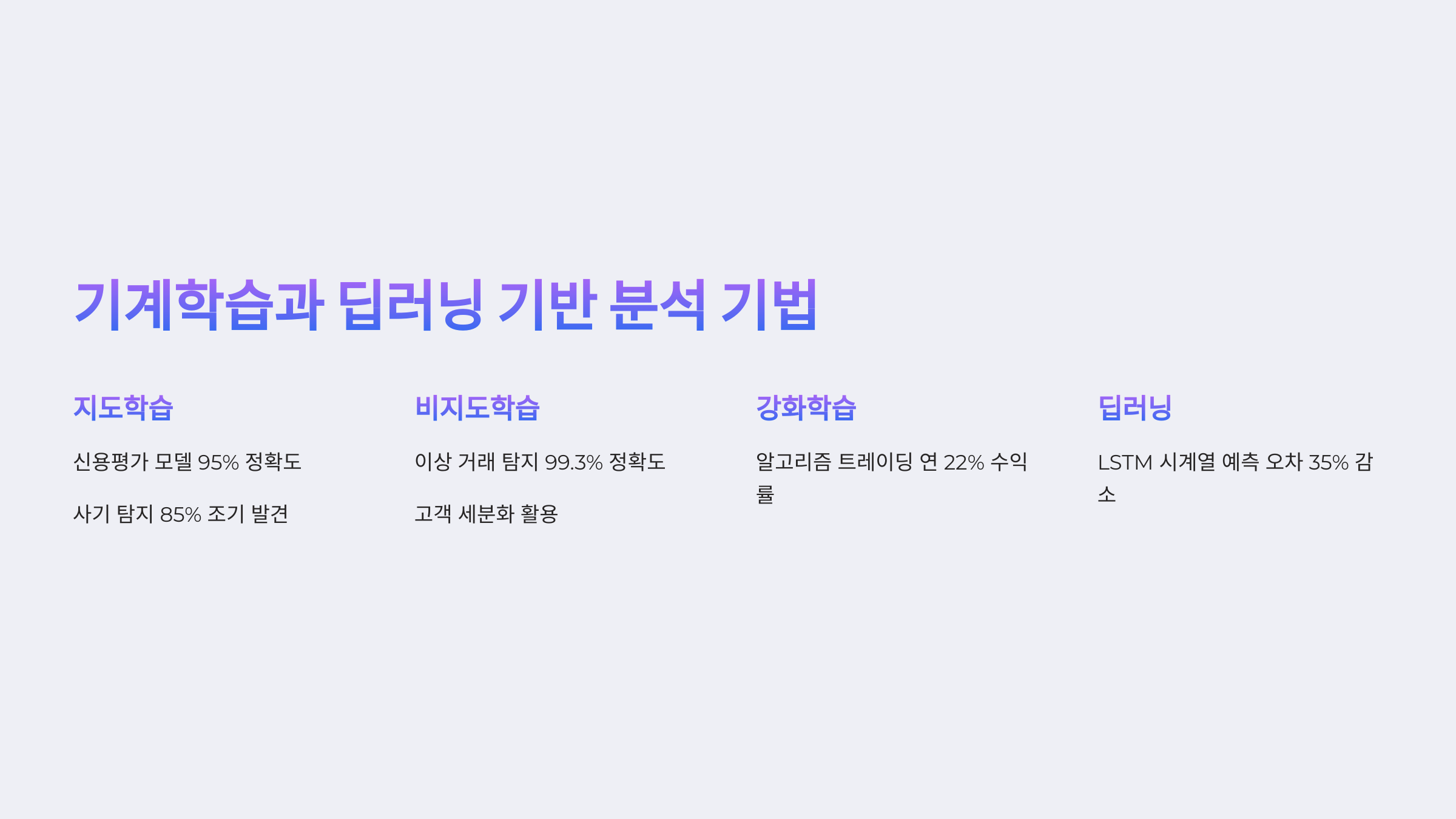 | 머신러닝 | 패턴 학습, 자동 분류 | 신용 등급 분류, 이상 거래 탐지 |