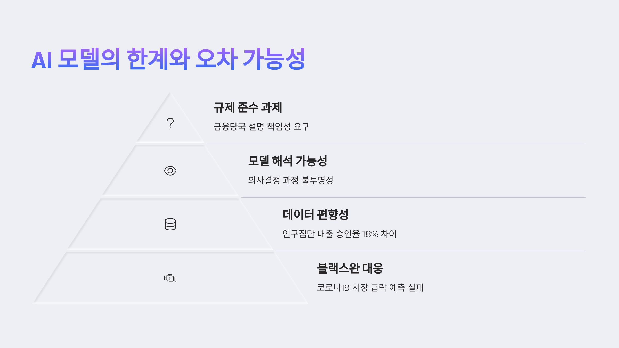 - 설명 가능성 부족: 왜 이런 결과가 나왔는지 인간이 해석하기 어려운 경우 많음